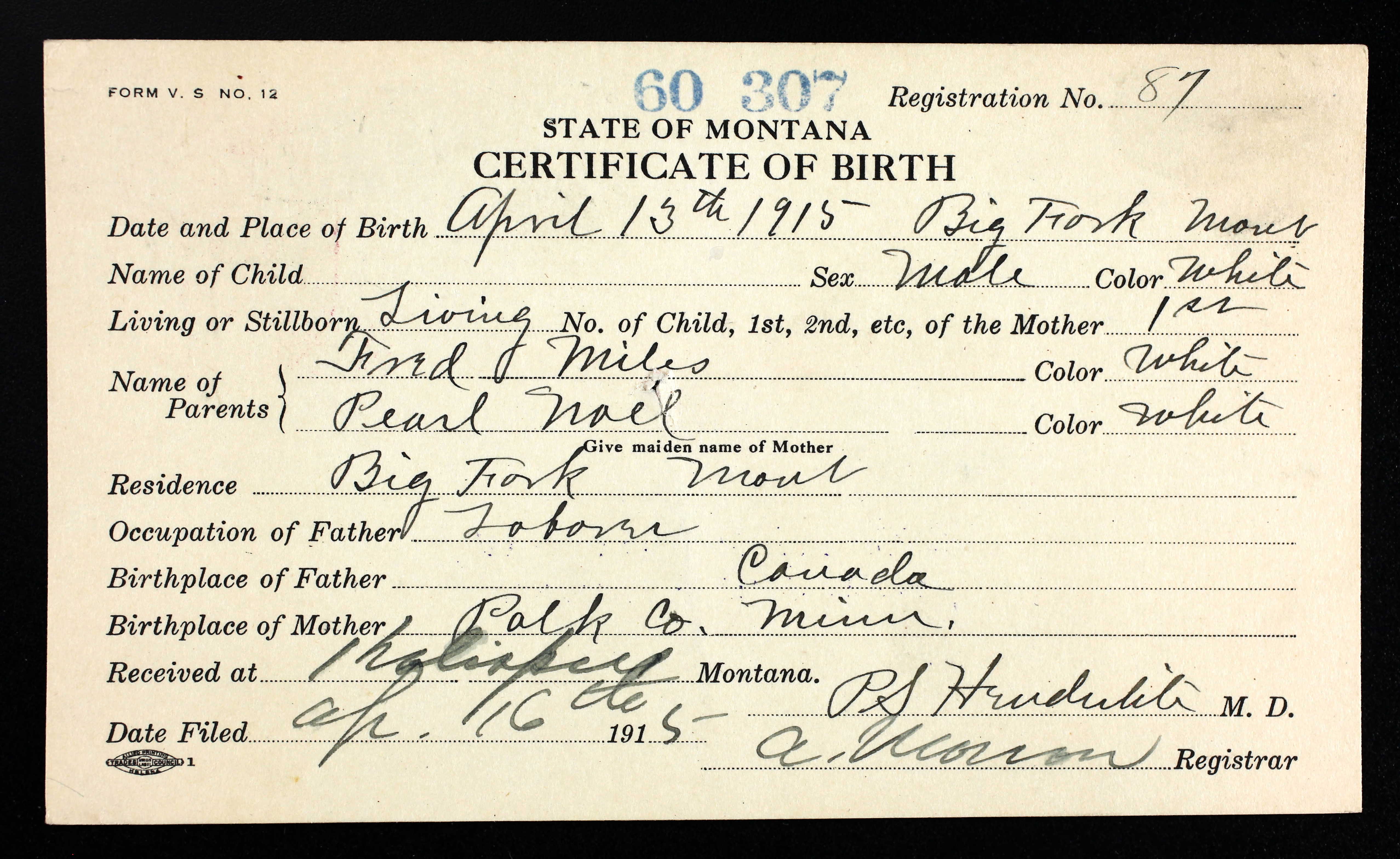 Robert Noeland Miles Birth Certificate