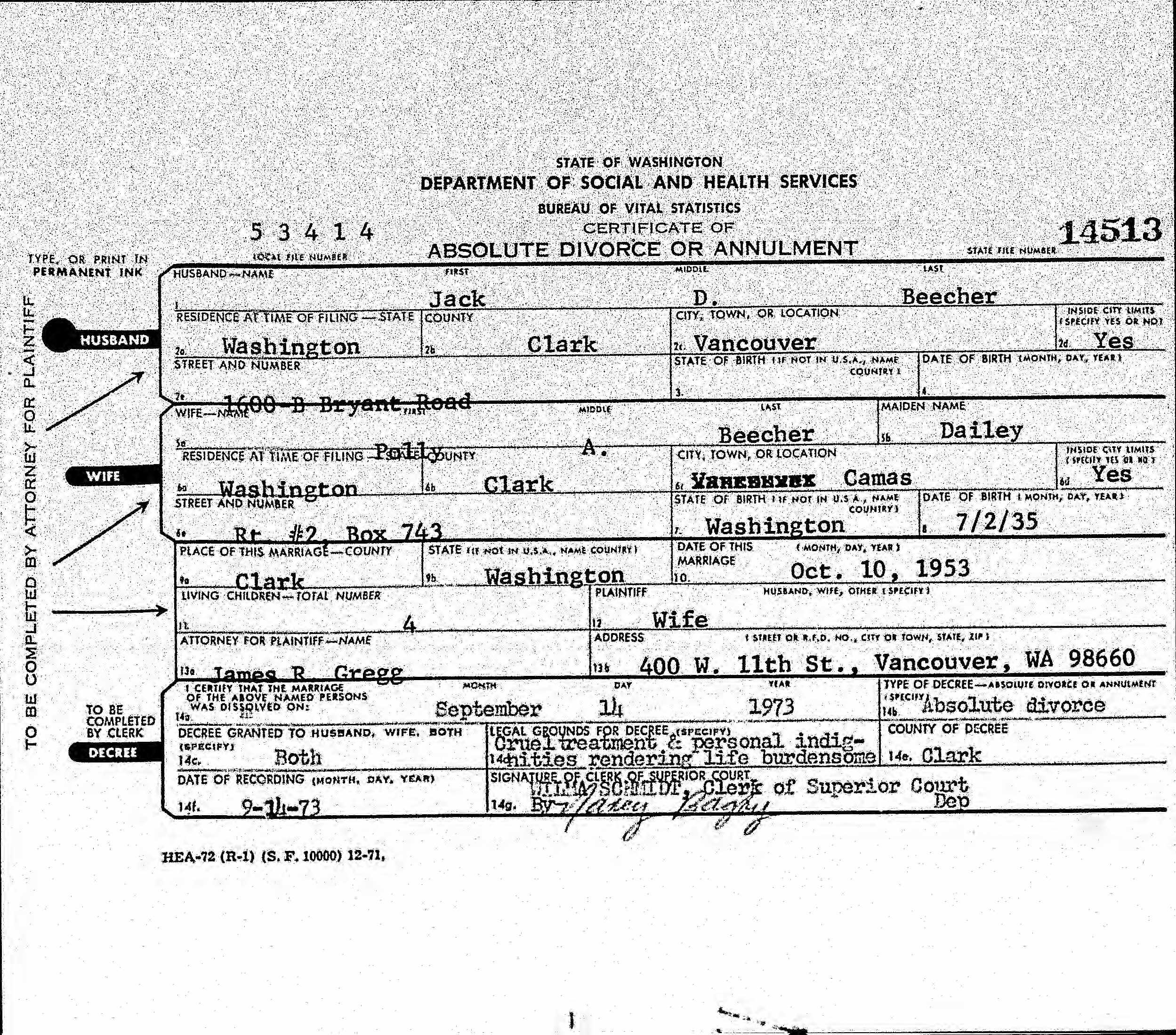 Jack D. Beecher and Polly Ann Beecher Divorce Record 1973