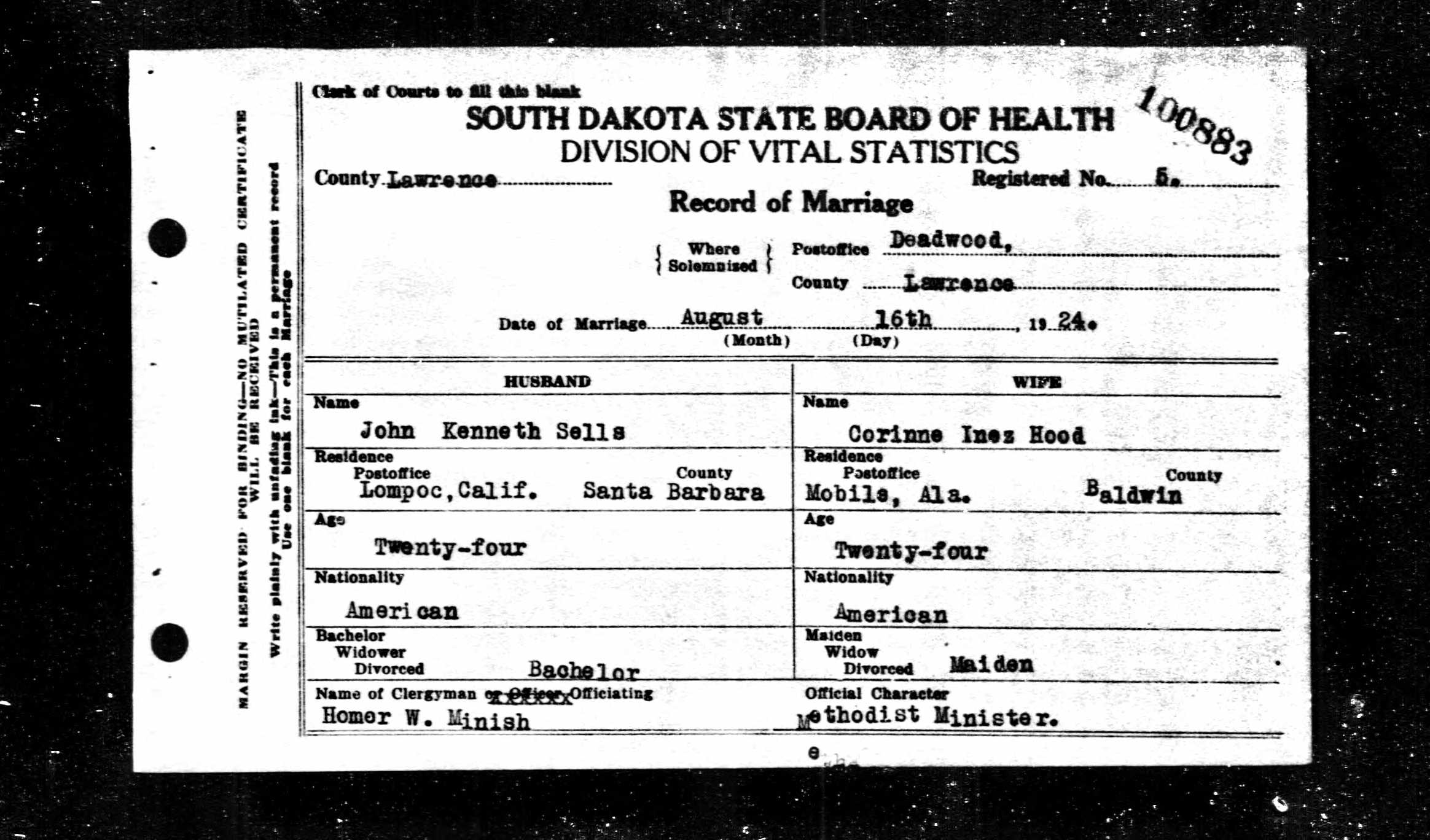 John Kenneth Sells and Corinne Ines Hood Marriage Record from South Dakota in 1924