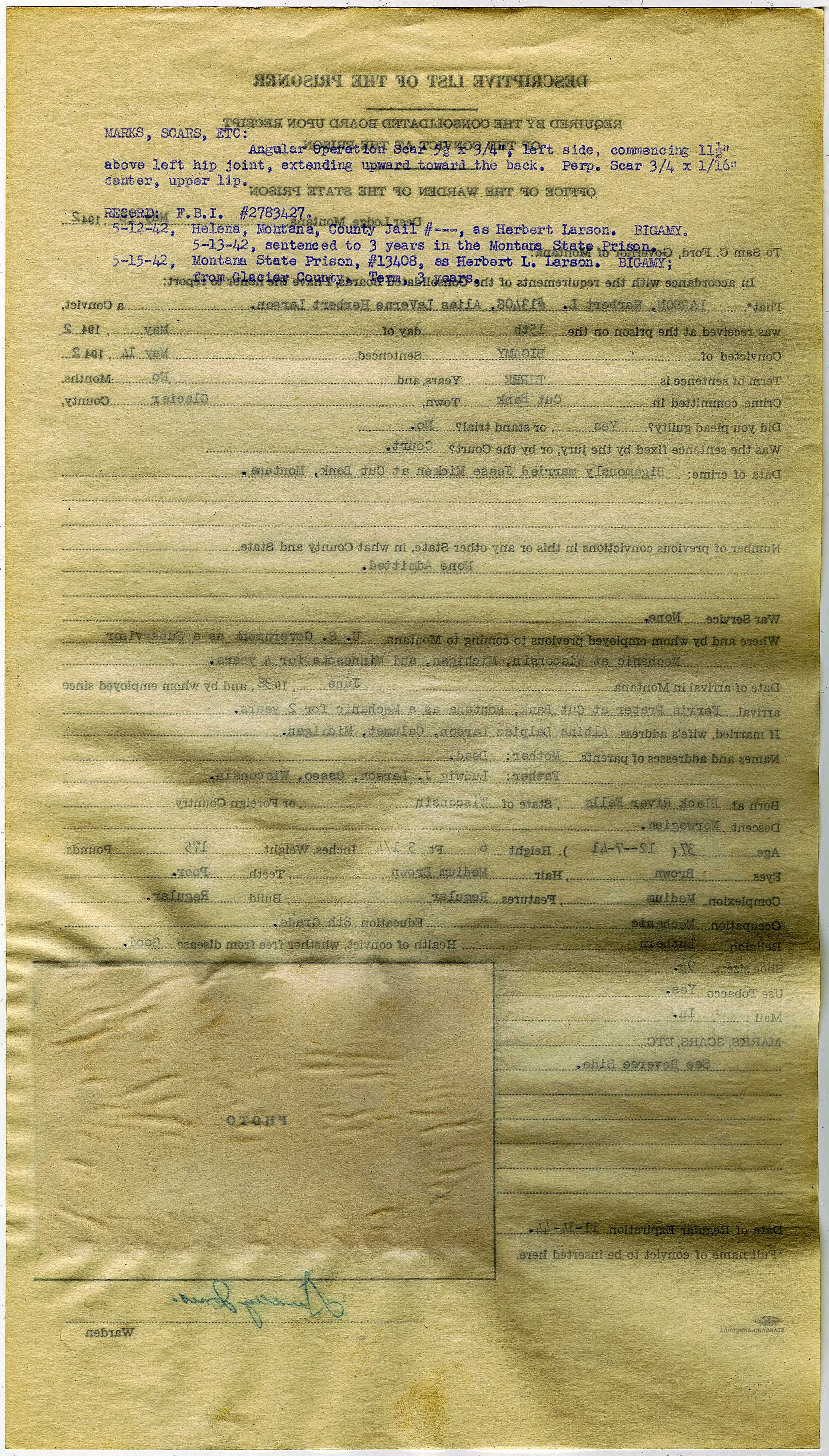 Montana State Prison Descriptive List of Prisoner LaVerne Herbert Larson, as he was received on May 15, 1942 (page 2 of 2)