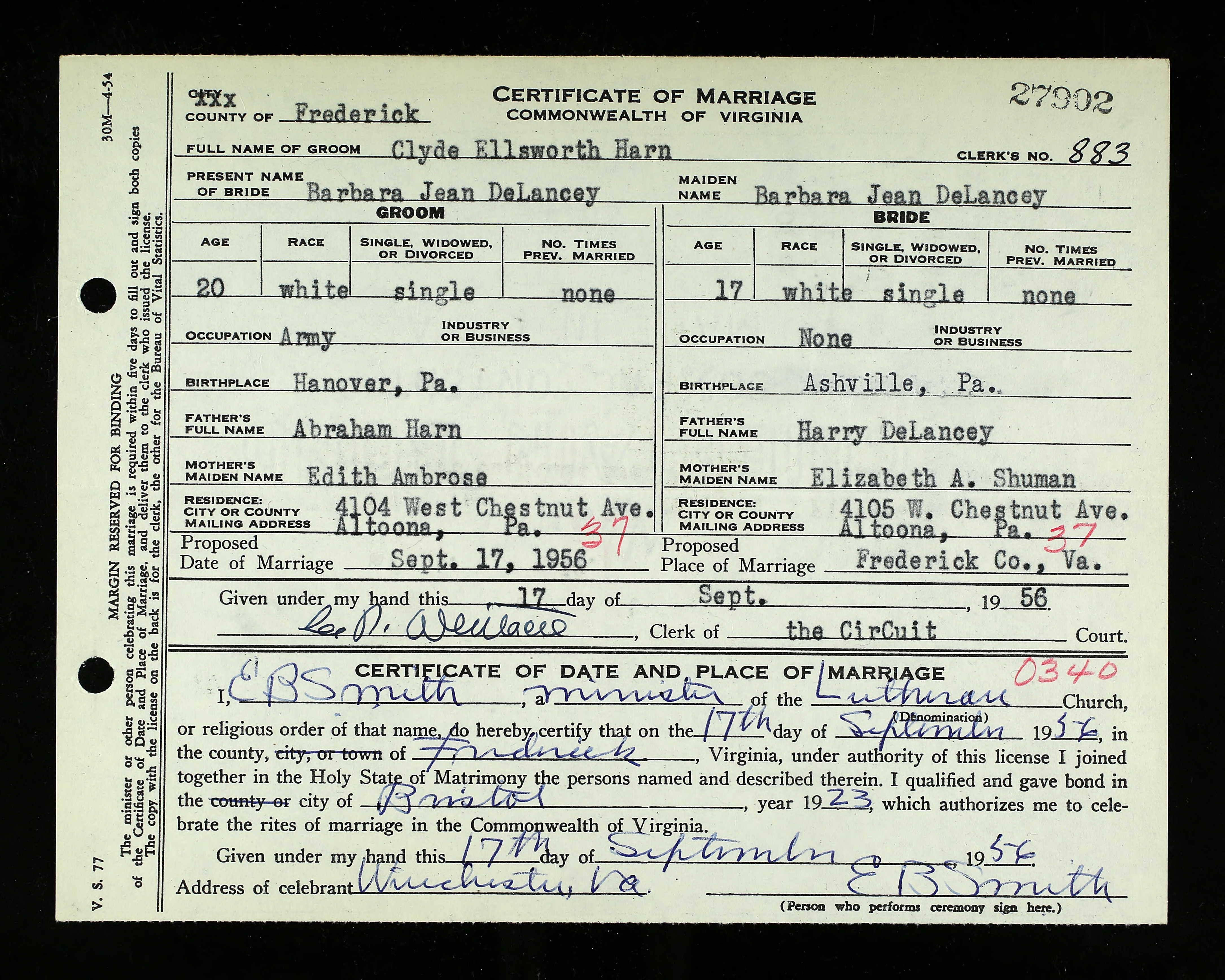 Marriage Certificate for Clyde Ellsworth Harn and Barbara Jean DeLancey