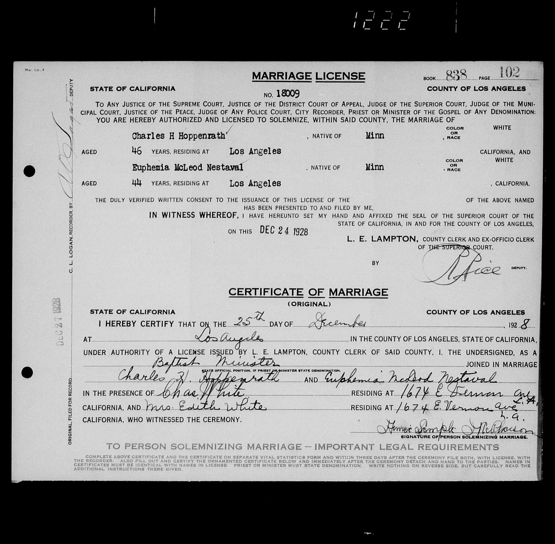 Euphemia McLeod Nestaval and Charles Hoppenrath Marriage Certificate