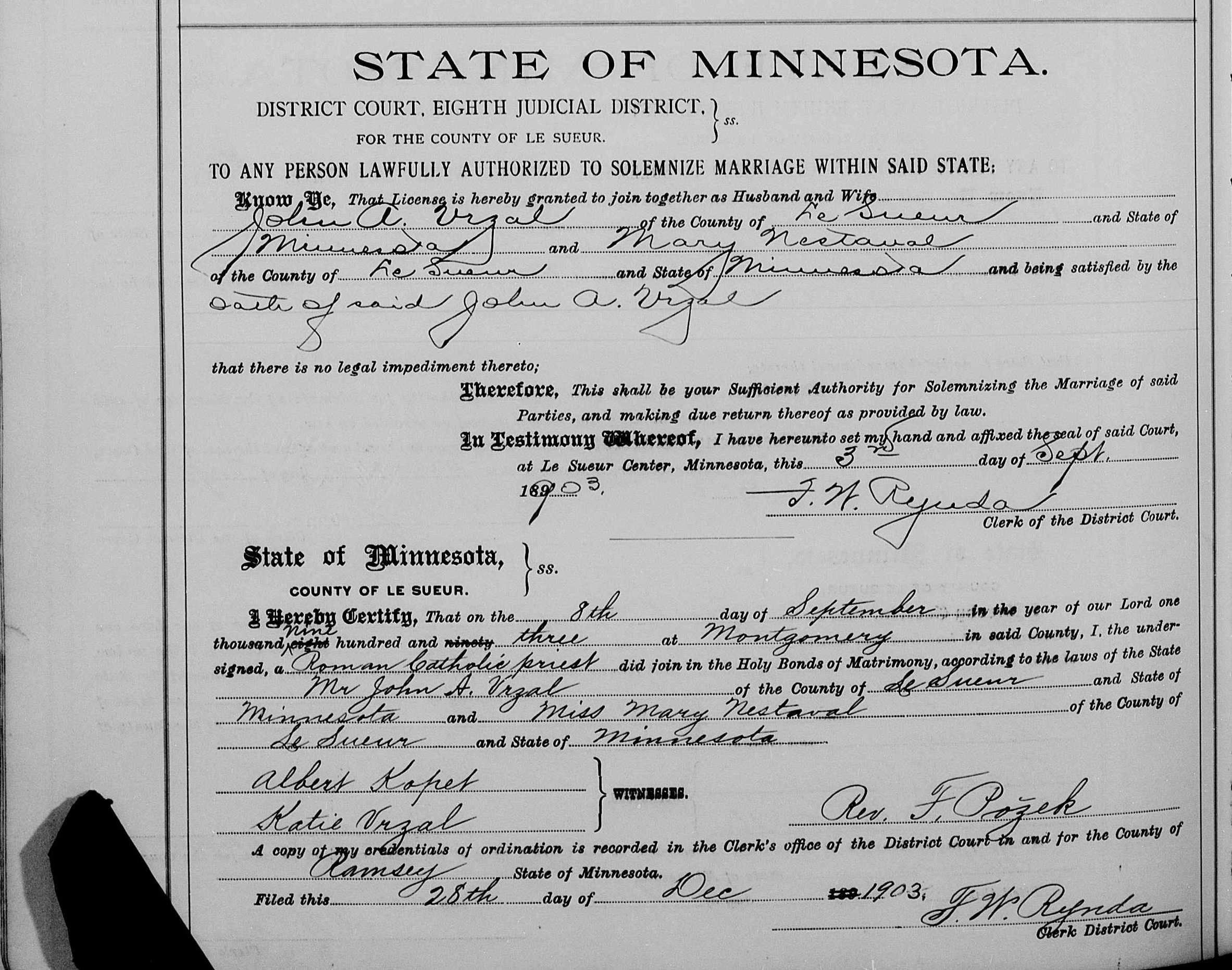 John A. Vrzal and Mary Nestaval Marriage Certificate