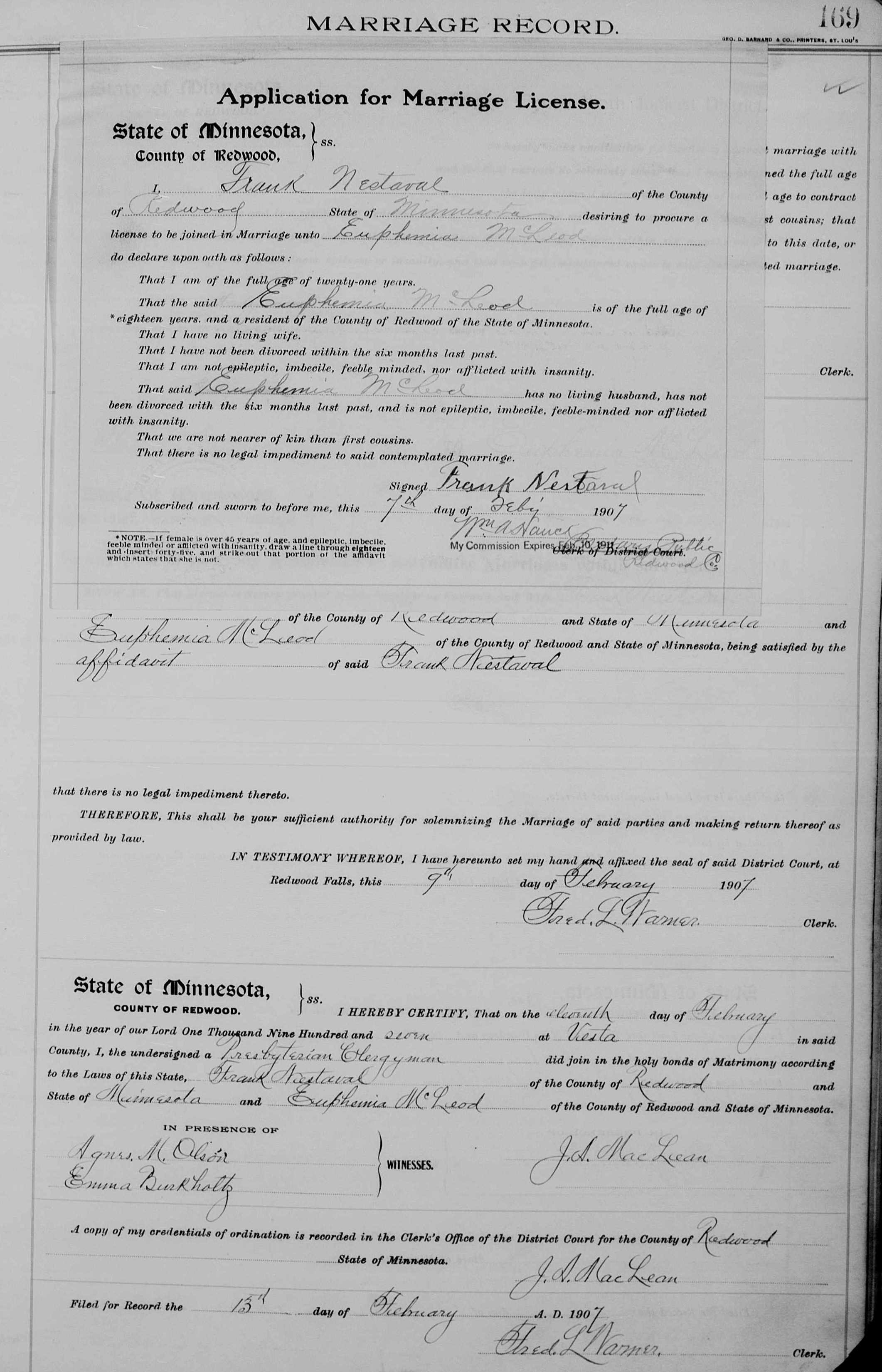 Frank Nestaval and Euphemia McLeod Marriage Certificate