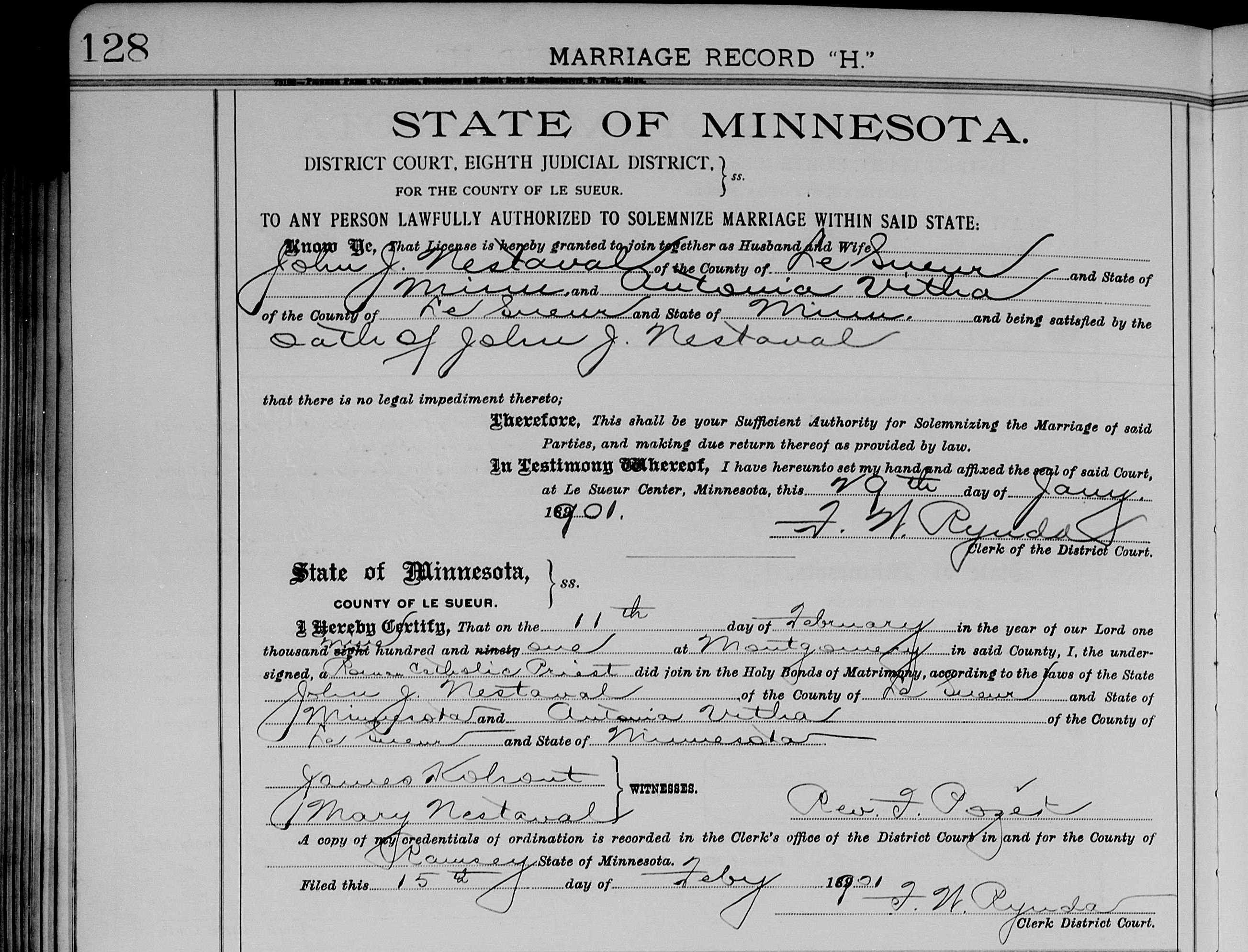 John J. Nestaval and Antonio Vitha Marriage Certificate