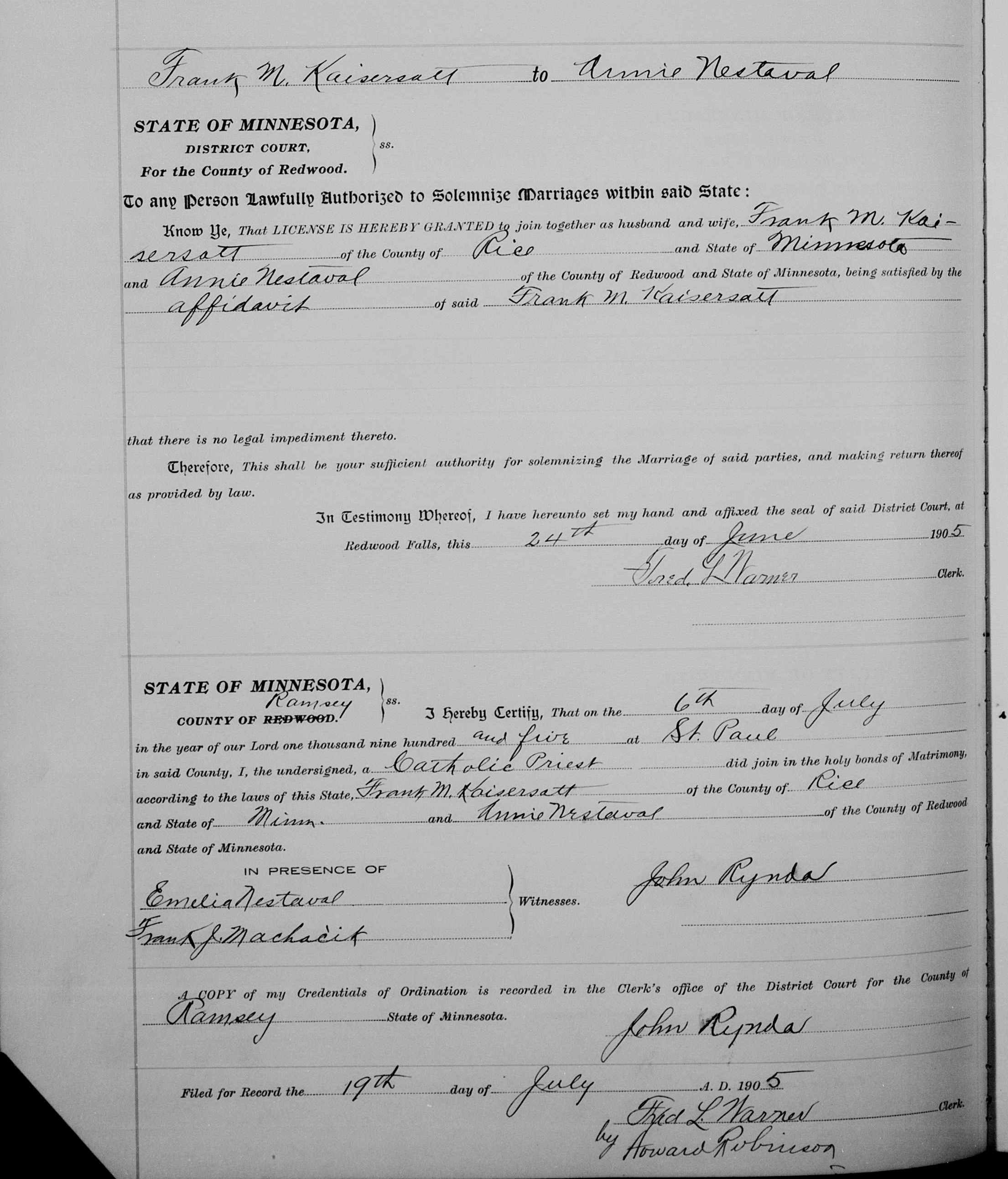 Annie Nestaval and Frank Kaisersatt Marriage Certificate