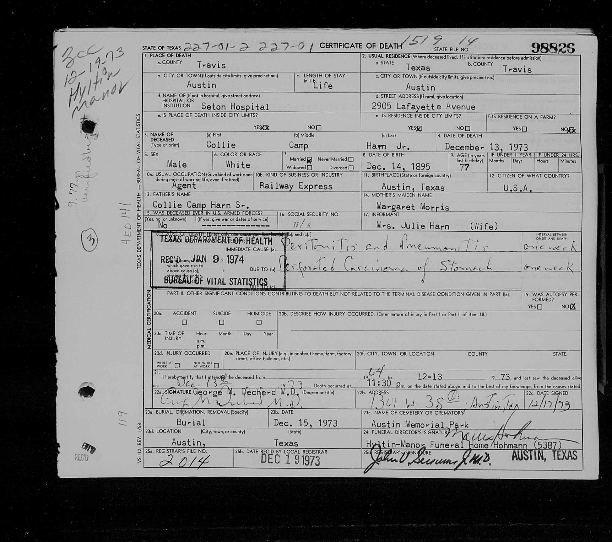 Collie Camp Harn Jr. Death Certificate