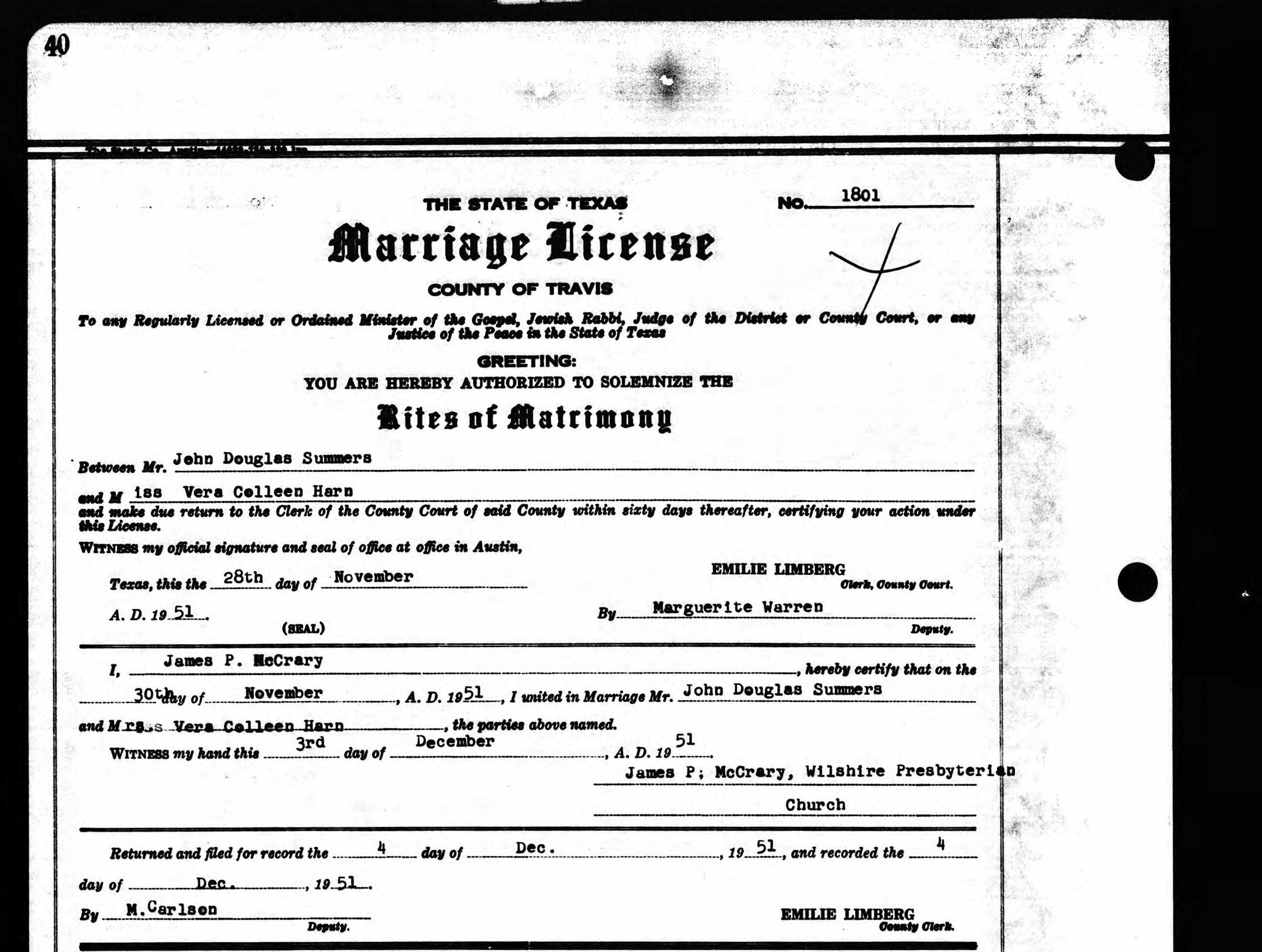 Vera Colleen Hand and John Douglas Summers Marriage Certificate