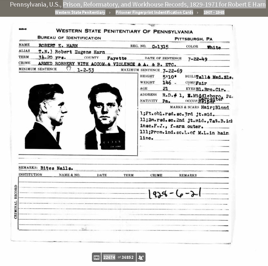 Fingerprint and Identifcation card from Western State Penitentiary in Pennsylvania for Robert Eugne Harn prisoner number C1315.