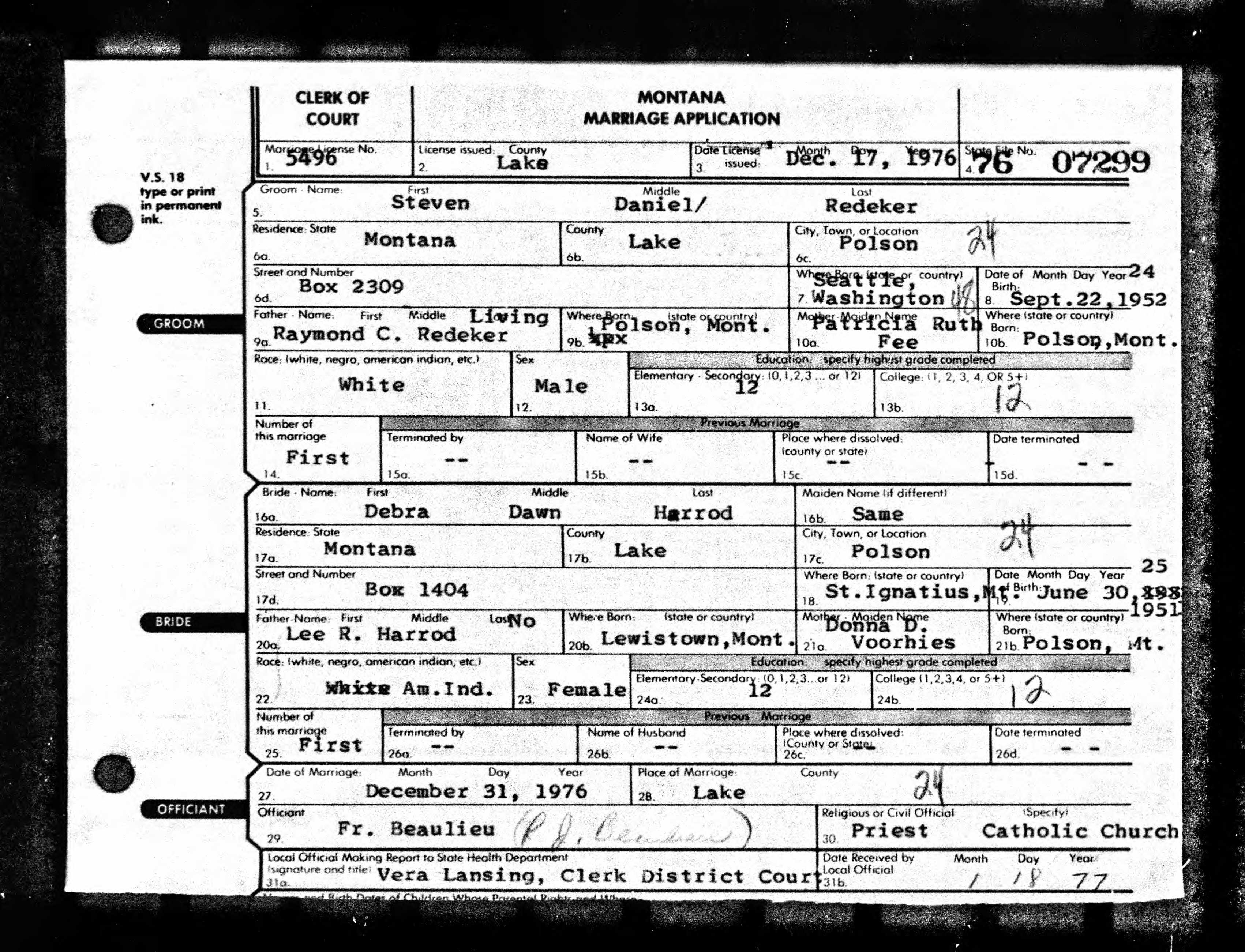 Marriage Certificate for Debra Dawn Harrod and Steven Redeker