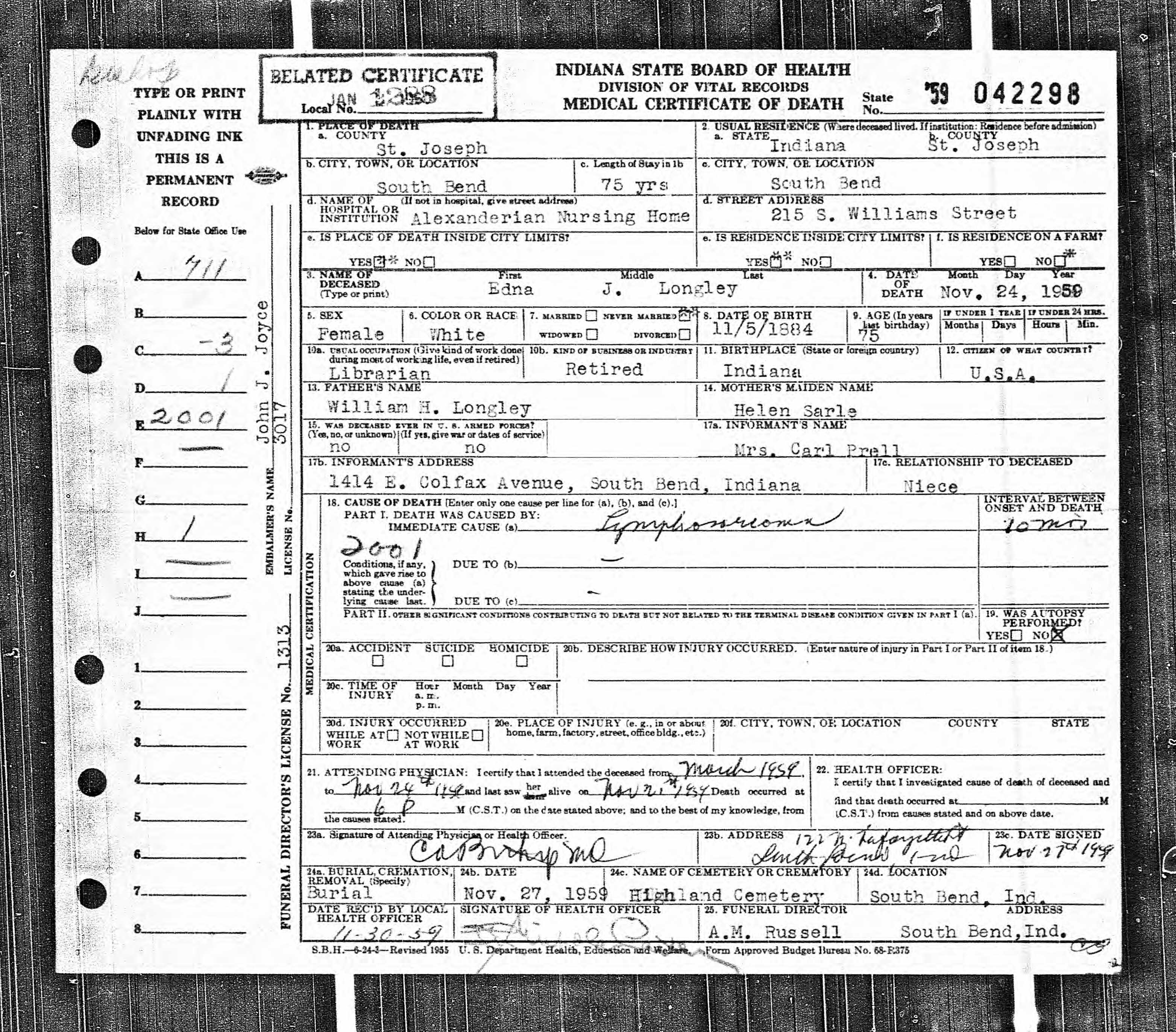 Death Certificate for Edna J. Longley