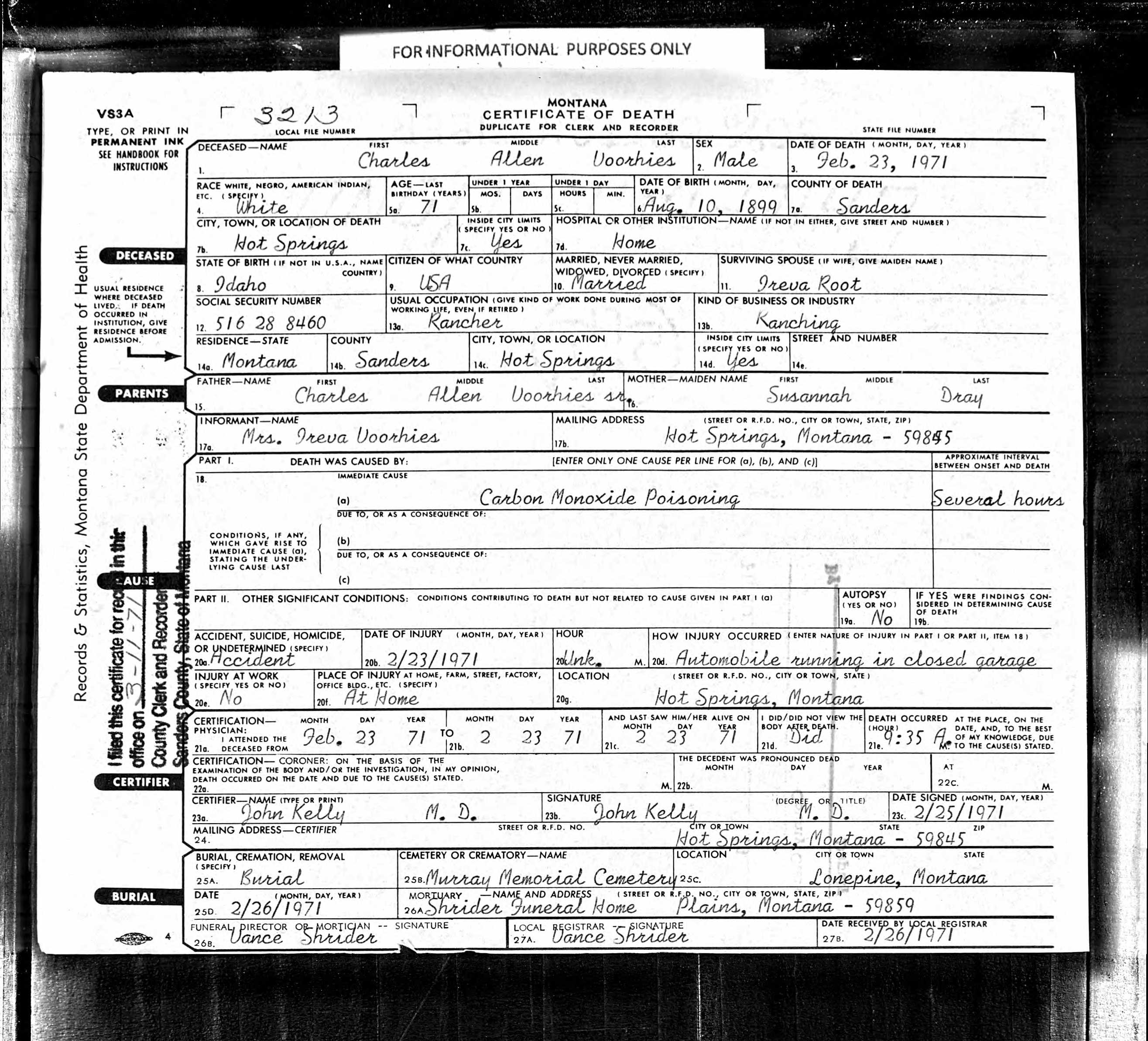 Charles Allen Voorhies Jr. Death Certificate