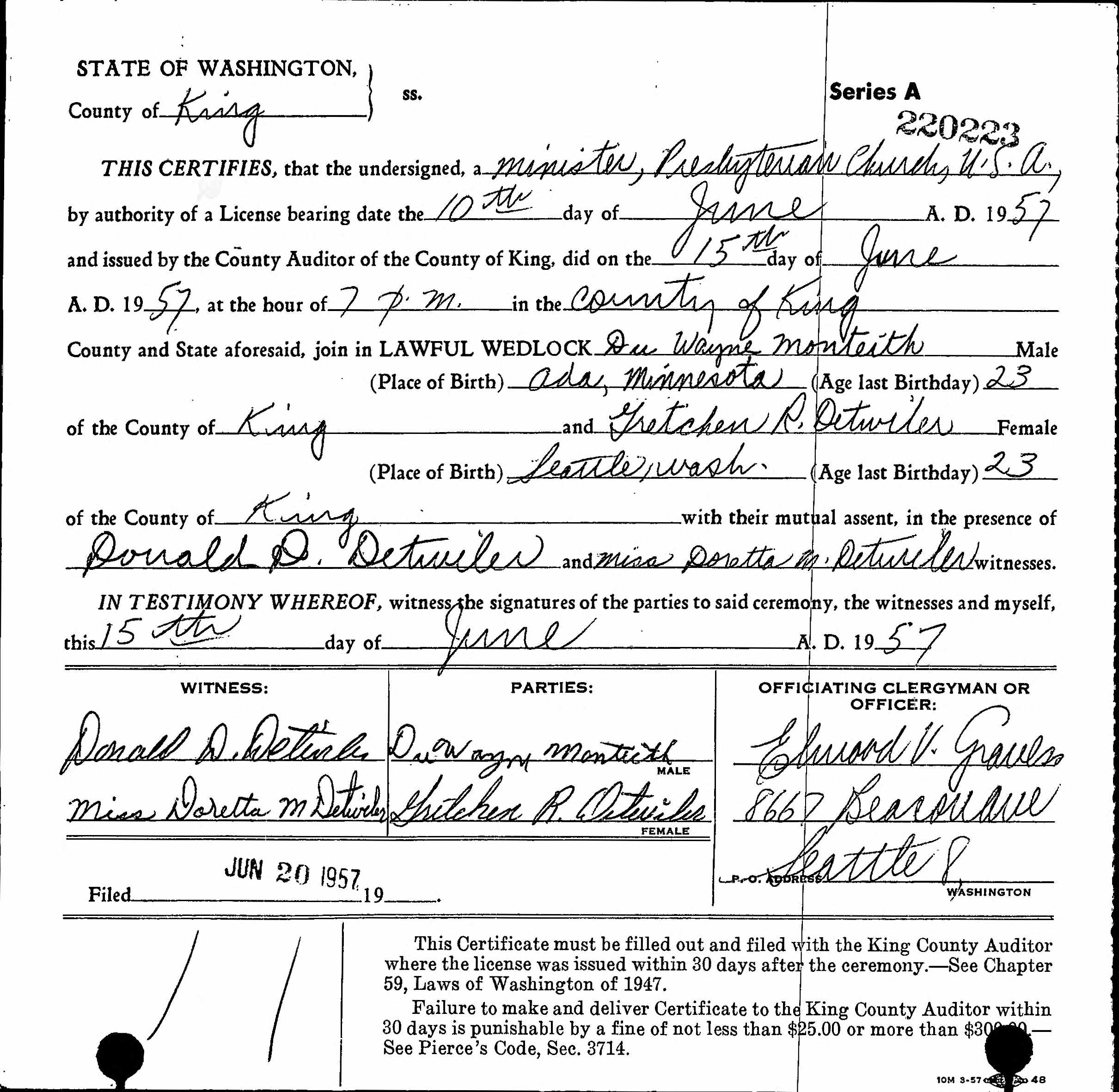 Marriage Certificate for Gretchen R Detwiler and Du Wayne Monteith in 1957