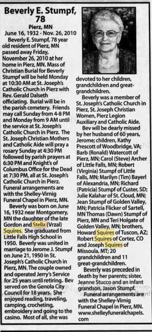 Obituary for Beverly E. Stumpf from The St. Cloud Times Newspaper, St. Cloud, MN, 28Nov2010, page 23.