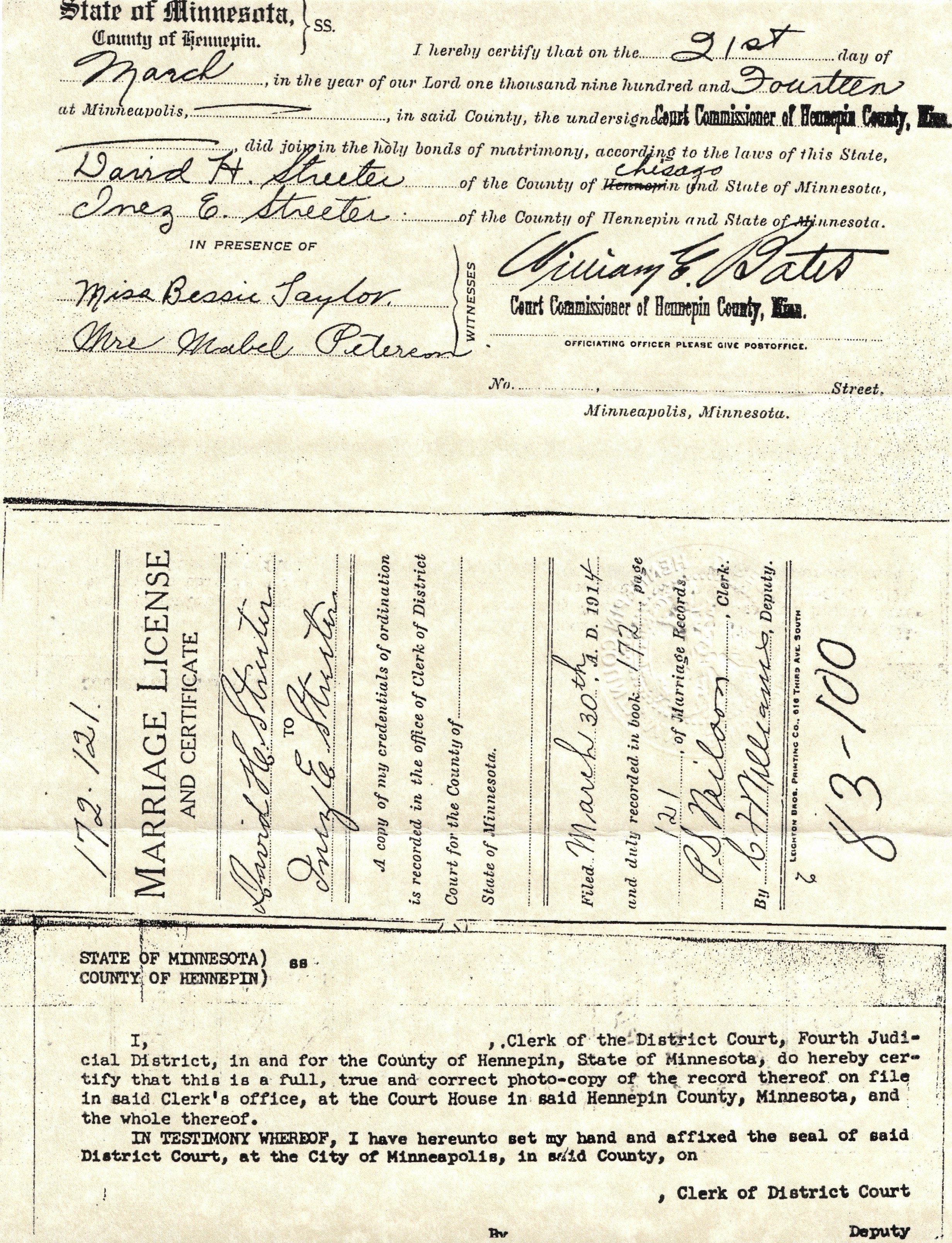 Marriage License and Certificate for David H. Streeter and Inez E. Streeter