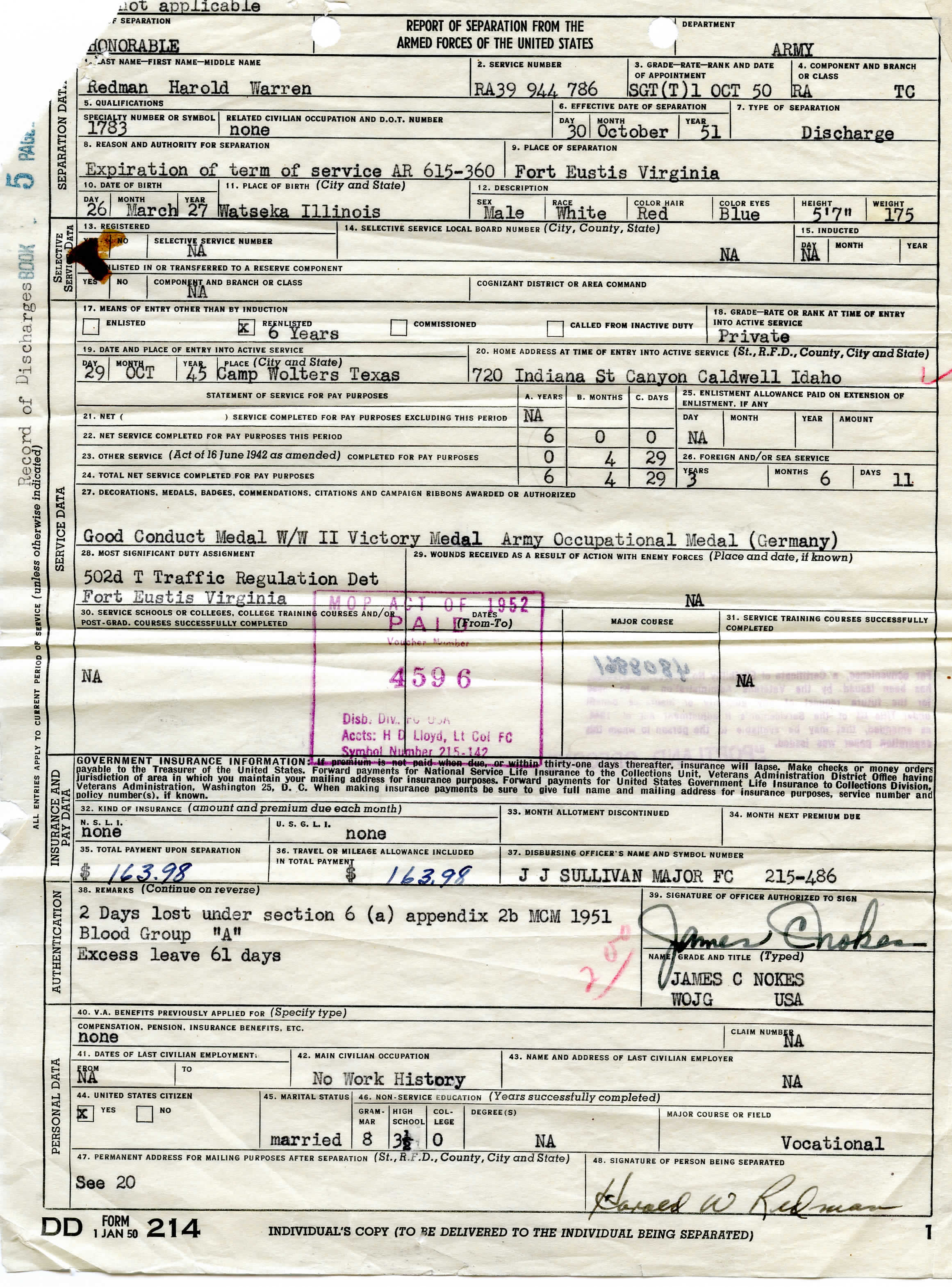 Harold Warren Redman -- DD Form 214 - Report of Separation from the Armed Forces of the United States