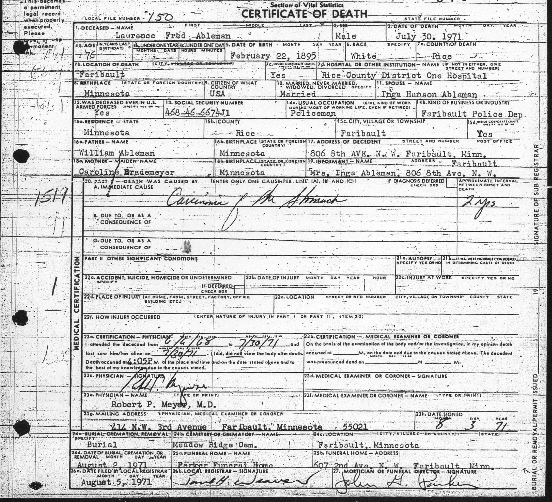 Abelman, Lawrence Fred - Death Certificate