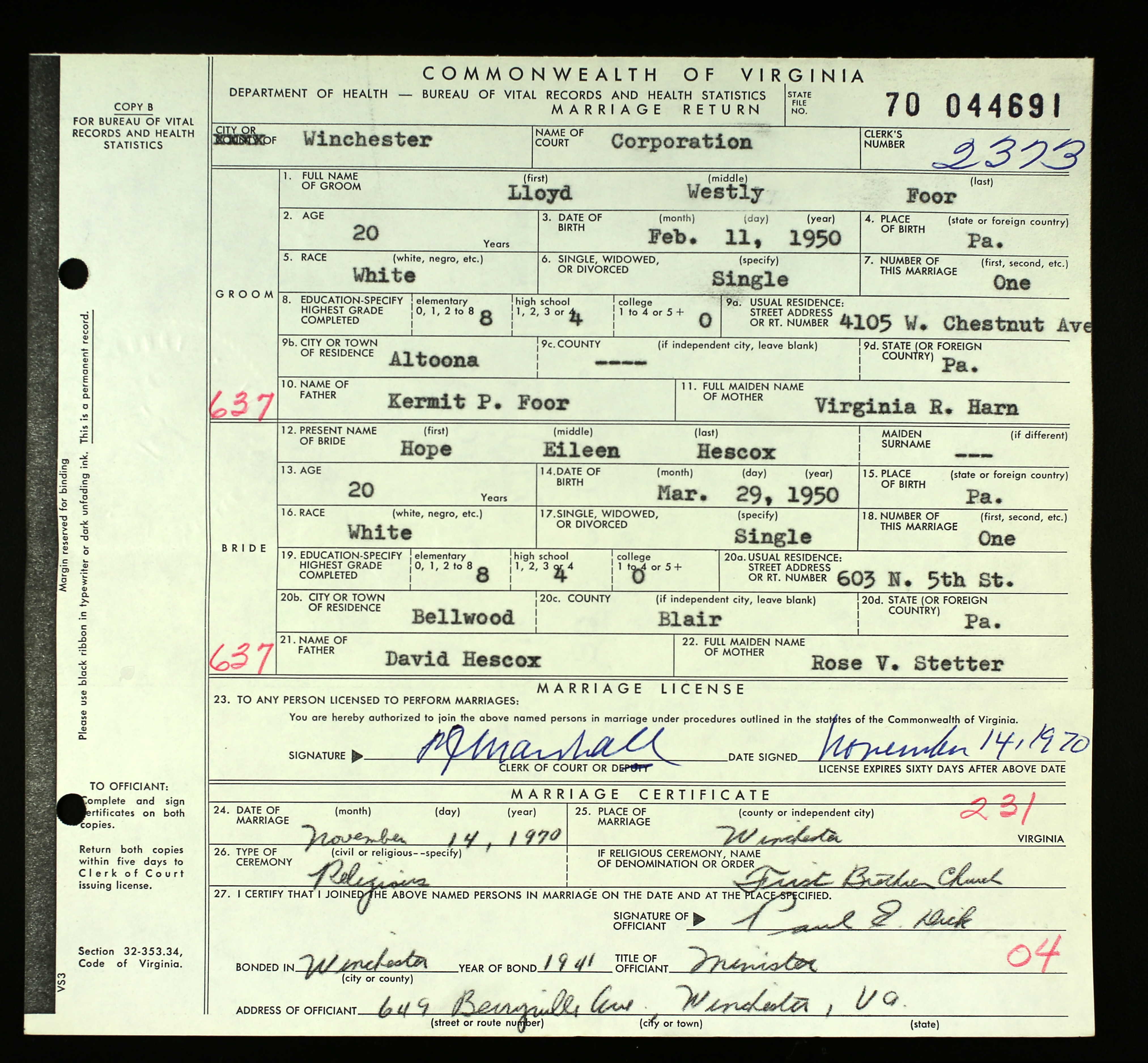 Marriage License and Certificate for Kermit P Foor and Hope Eileen Hescox in 1970