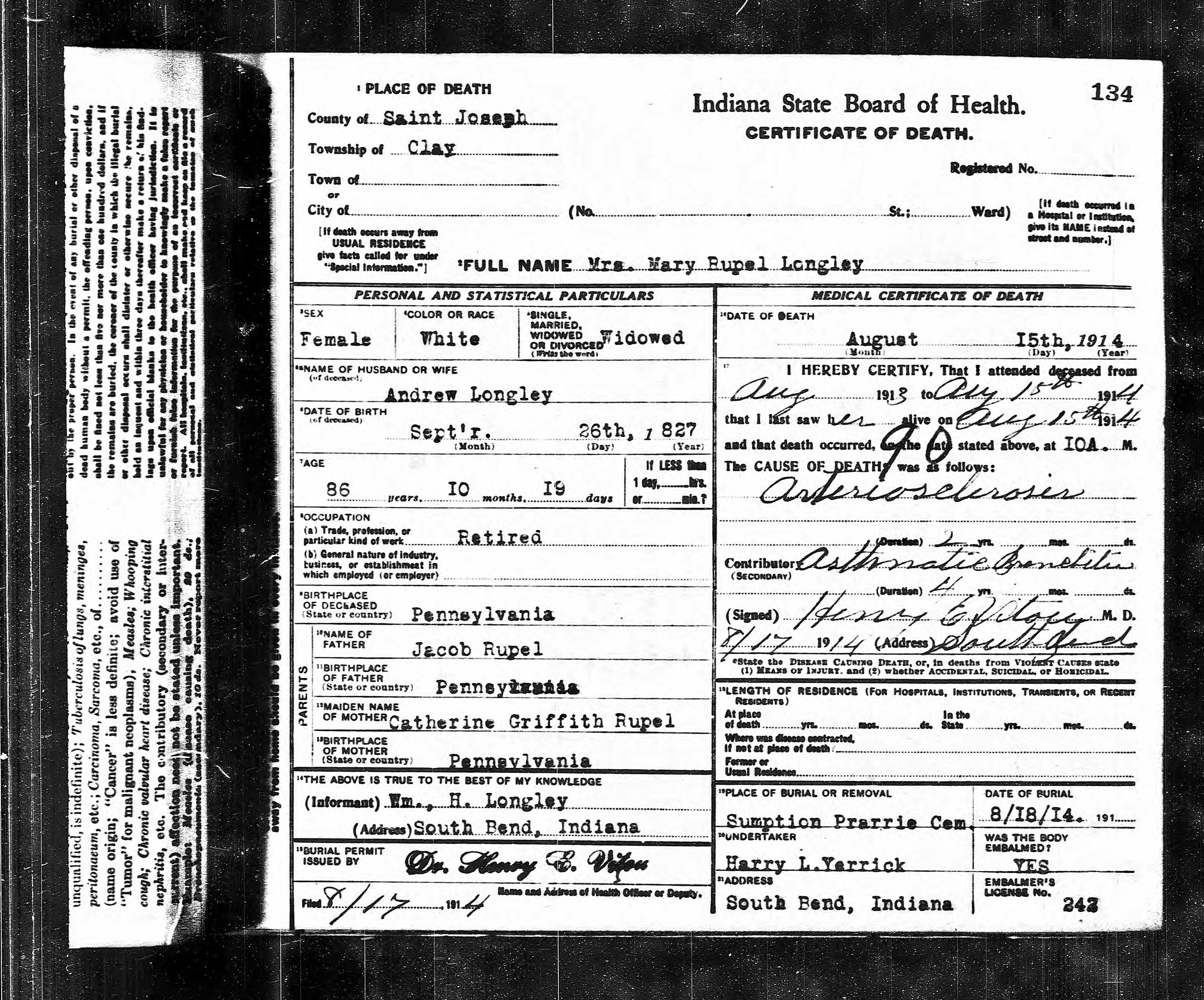 Mary Rupel Longley Indiana Death Certificate