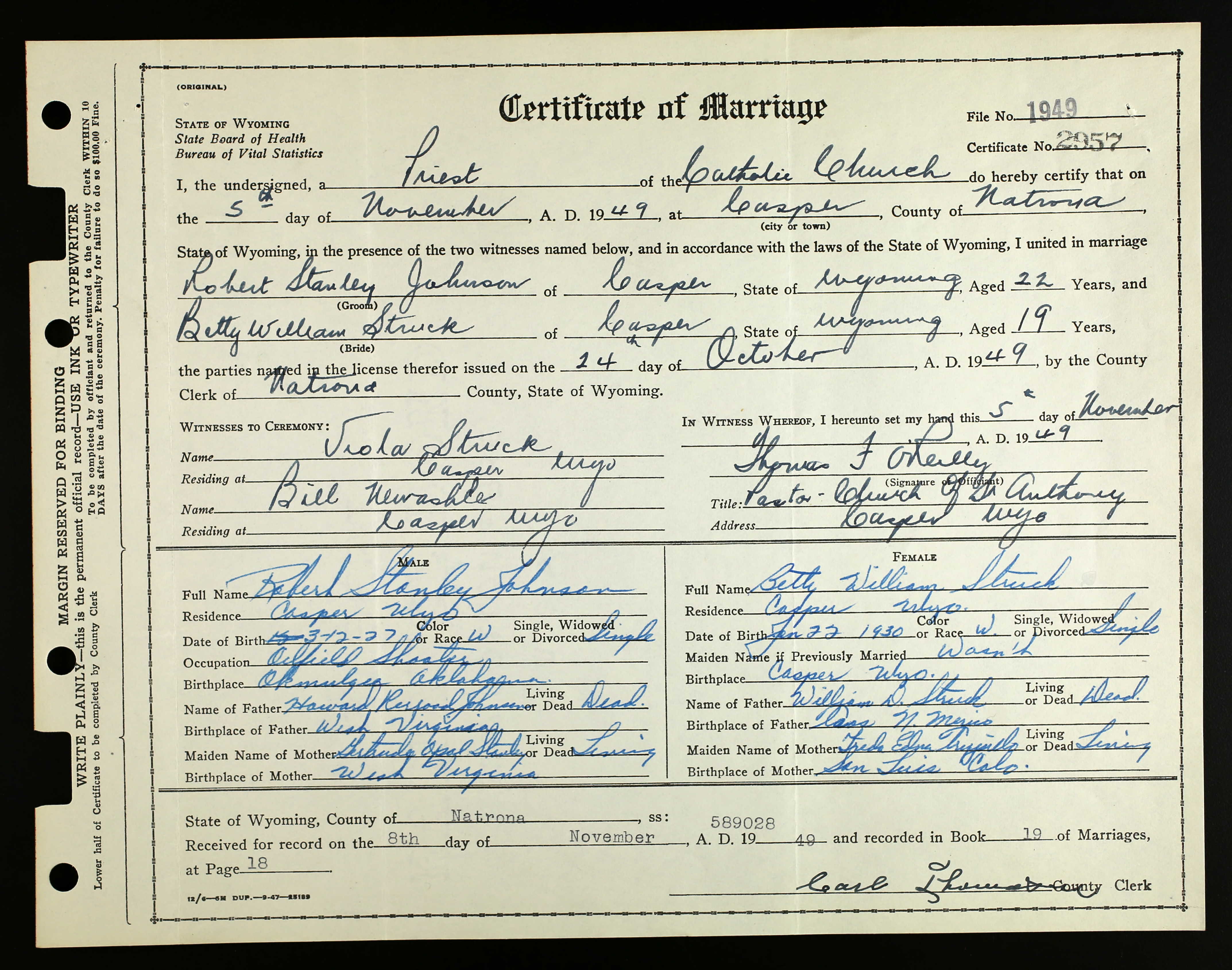 Betty William Struck and Robert Stanley Johnson Marriage Certificate in 1949