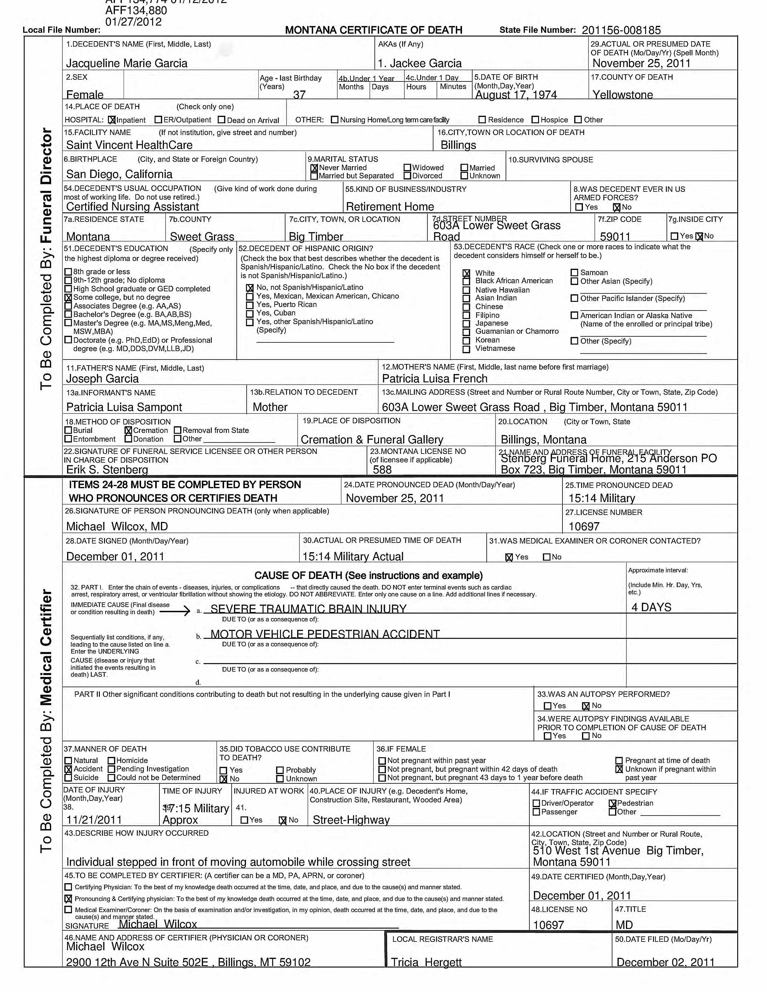 Jacqueline Marie Garcia Death Certificate