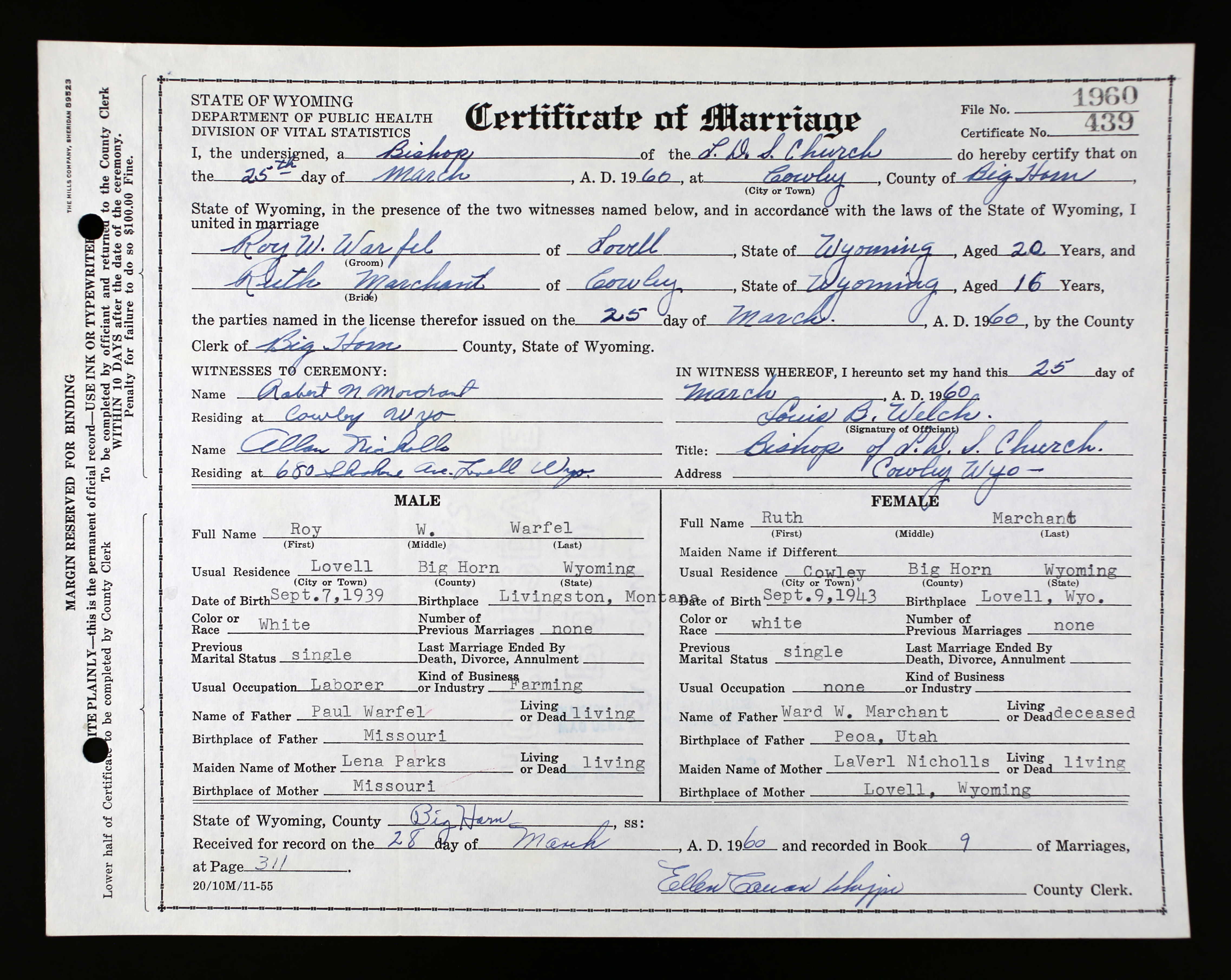 Leroy William Warfel Marriage Certificate
