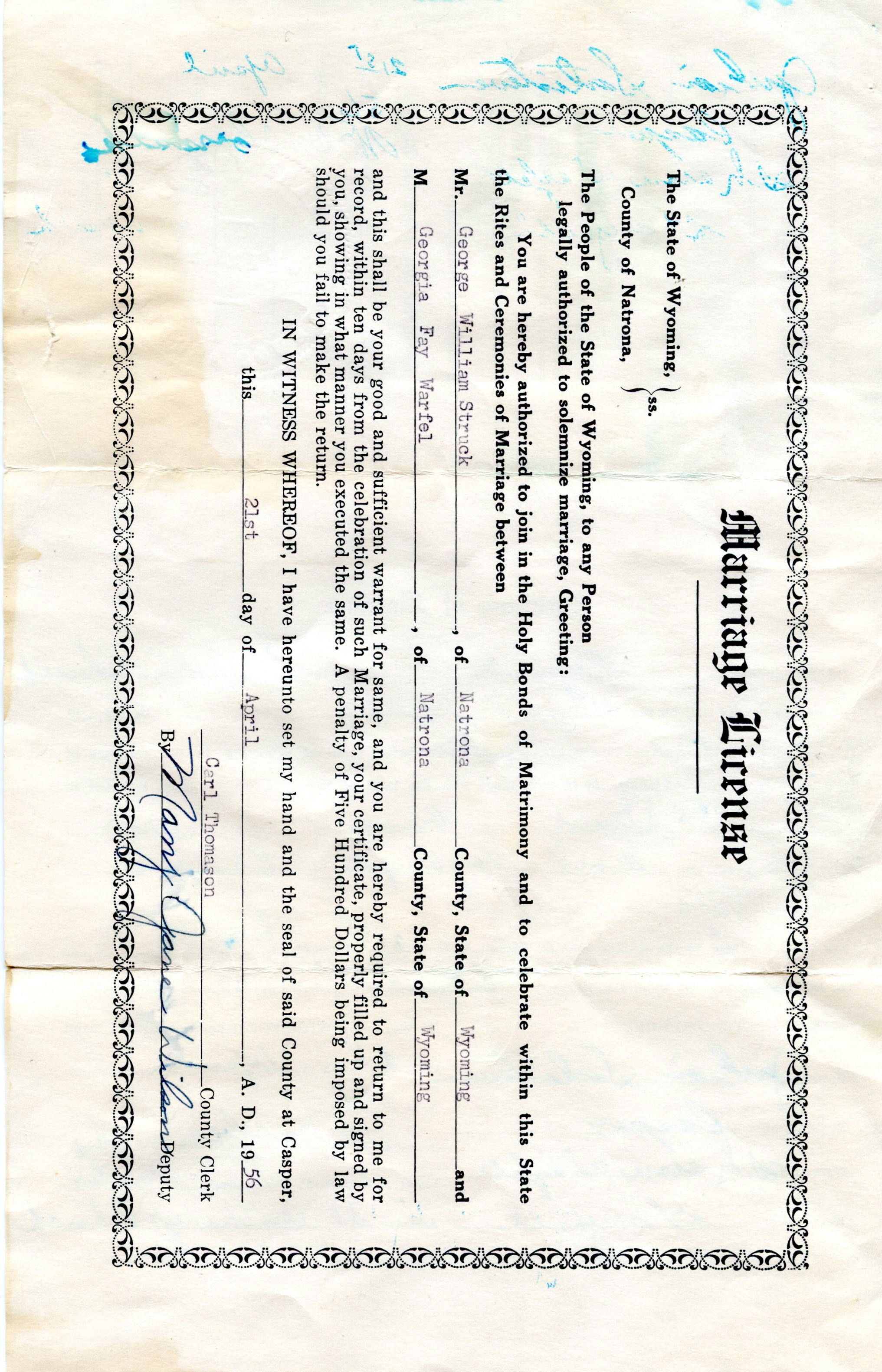 George William Struck and Georgia Fay Warfel Marriage License