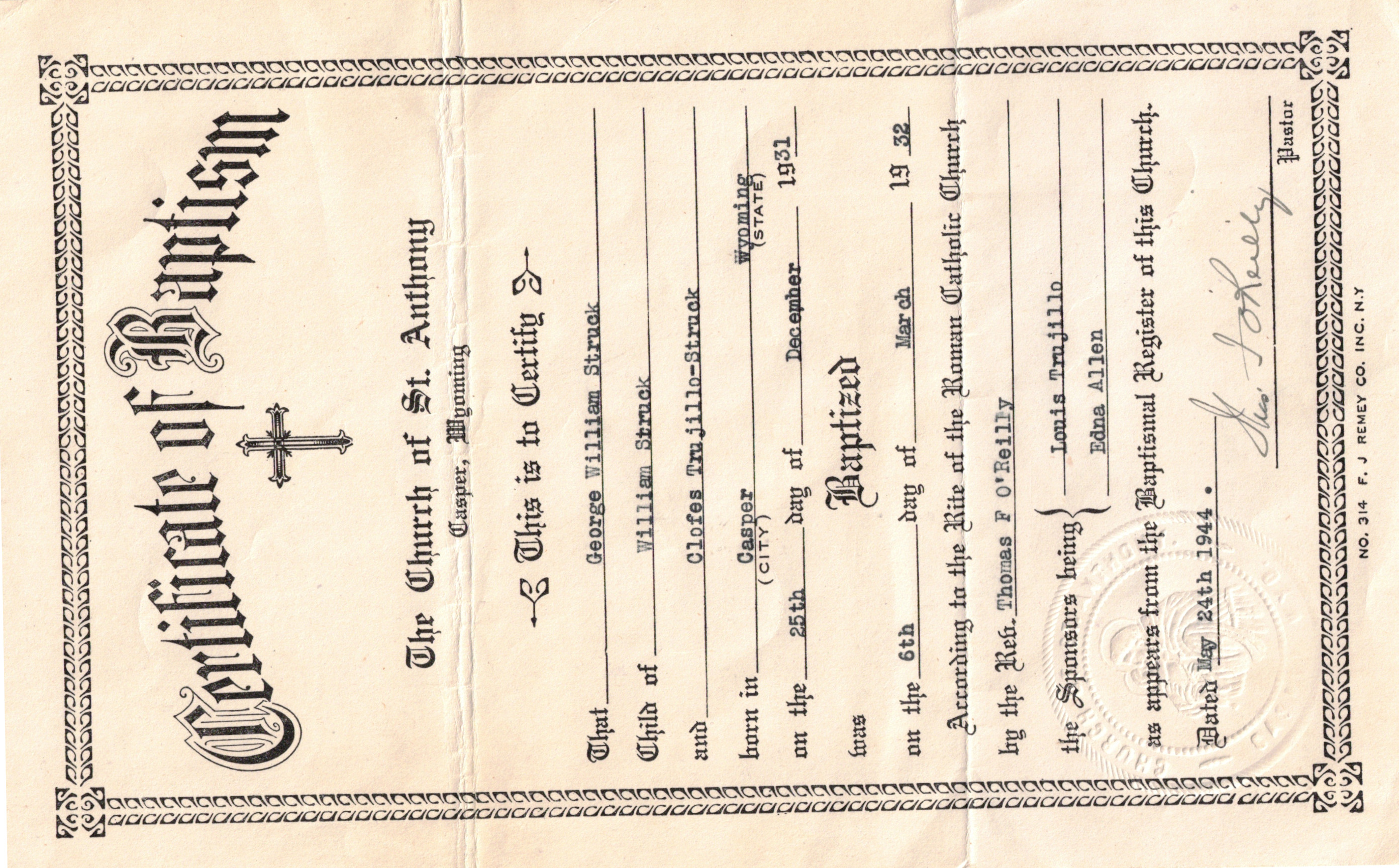 Certificate of Baptisim for George William Struck, St. Anthony Catholic Church, Casper, Wyoming, 06Mar1932