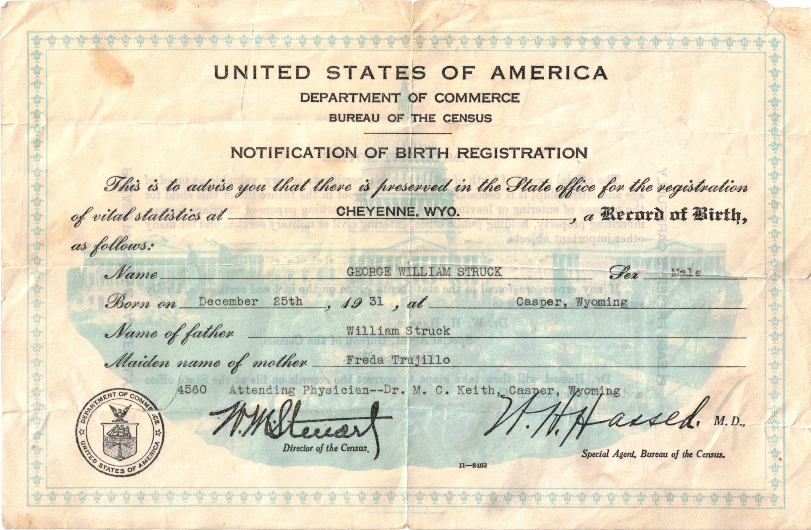 Notification of Birth Registration for George William Struck, born 25Dec1931 Casper Wyoming, from Bureau of the Census