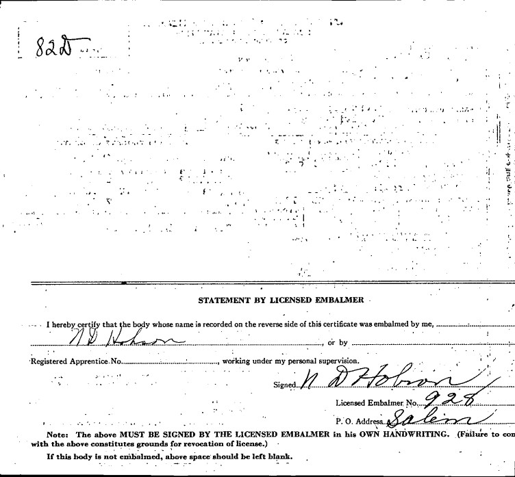 Thomas Brewster Warel Certificate of Death page 2 (Statement by licensed embalmer)
