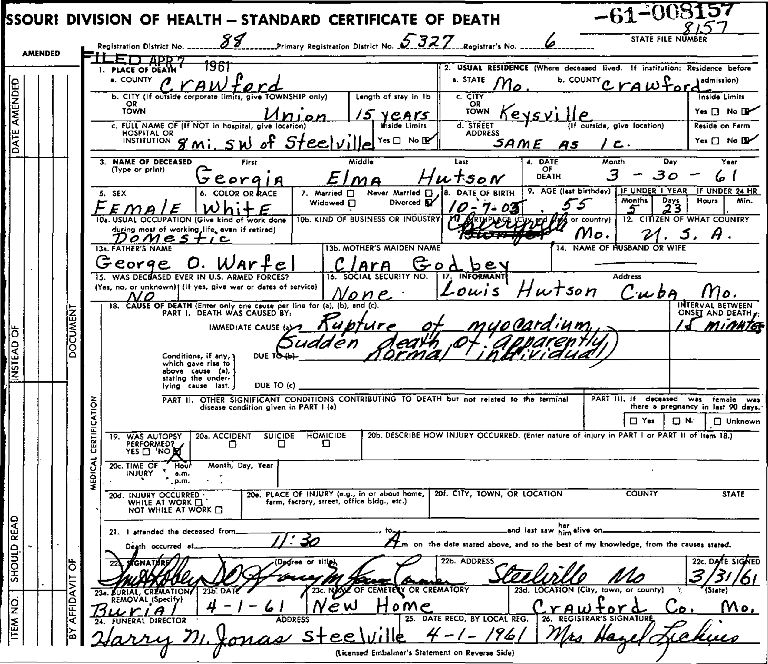 Georgia Elma Hutson Certificate of Death