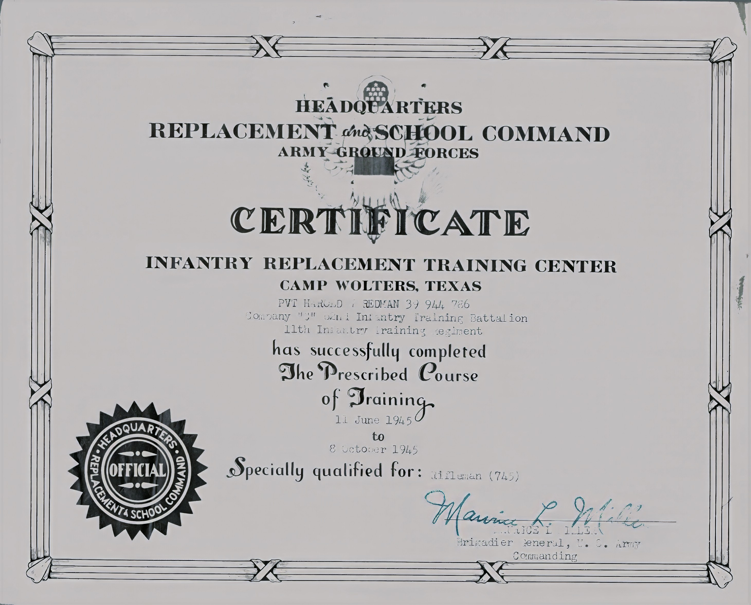 PVT Harold Redman Certifiicate of training completion at Camp Wolters, Texas in 1945
