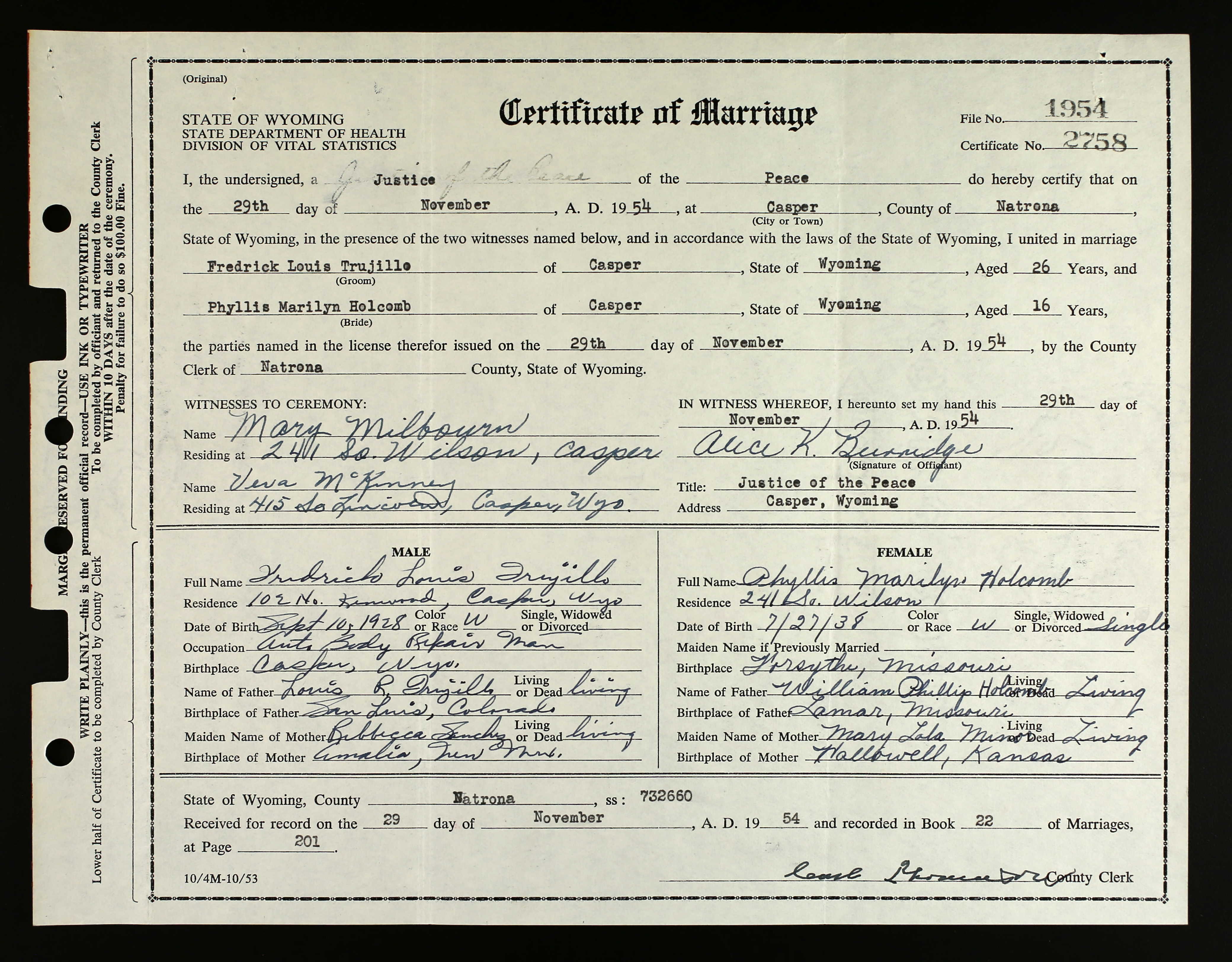 Fredrick Louis Trujillo and Phyllis Marilyn Holcomb Marriage Certificate in 1954