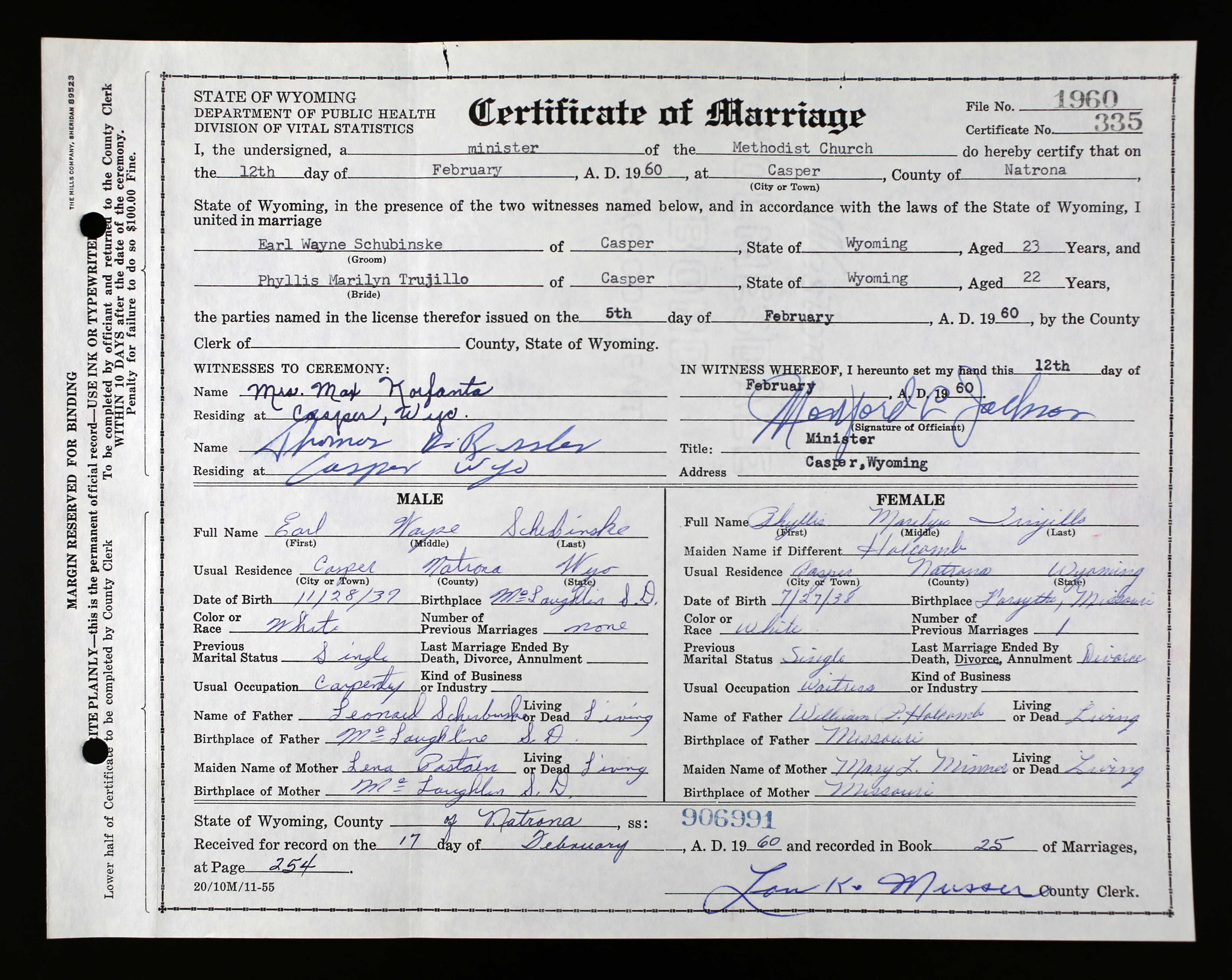 Phyllis Marilyn Trujillo and Earl Wayne Schubinske Marriage Certificate in 1960