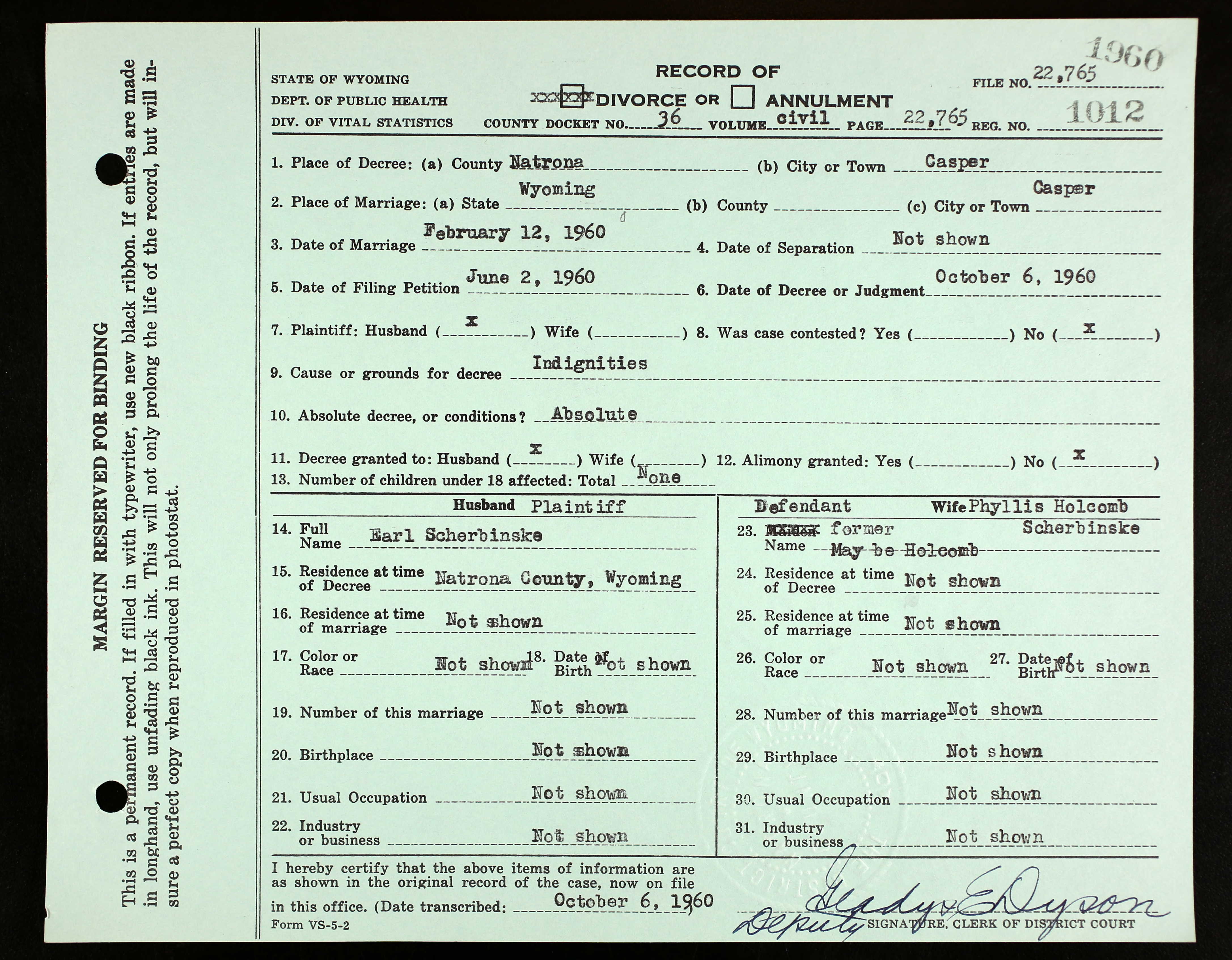 Phyllis Holcomb Scherbinske and Earl Scherbinske Divorce Record Oct1960
