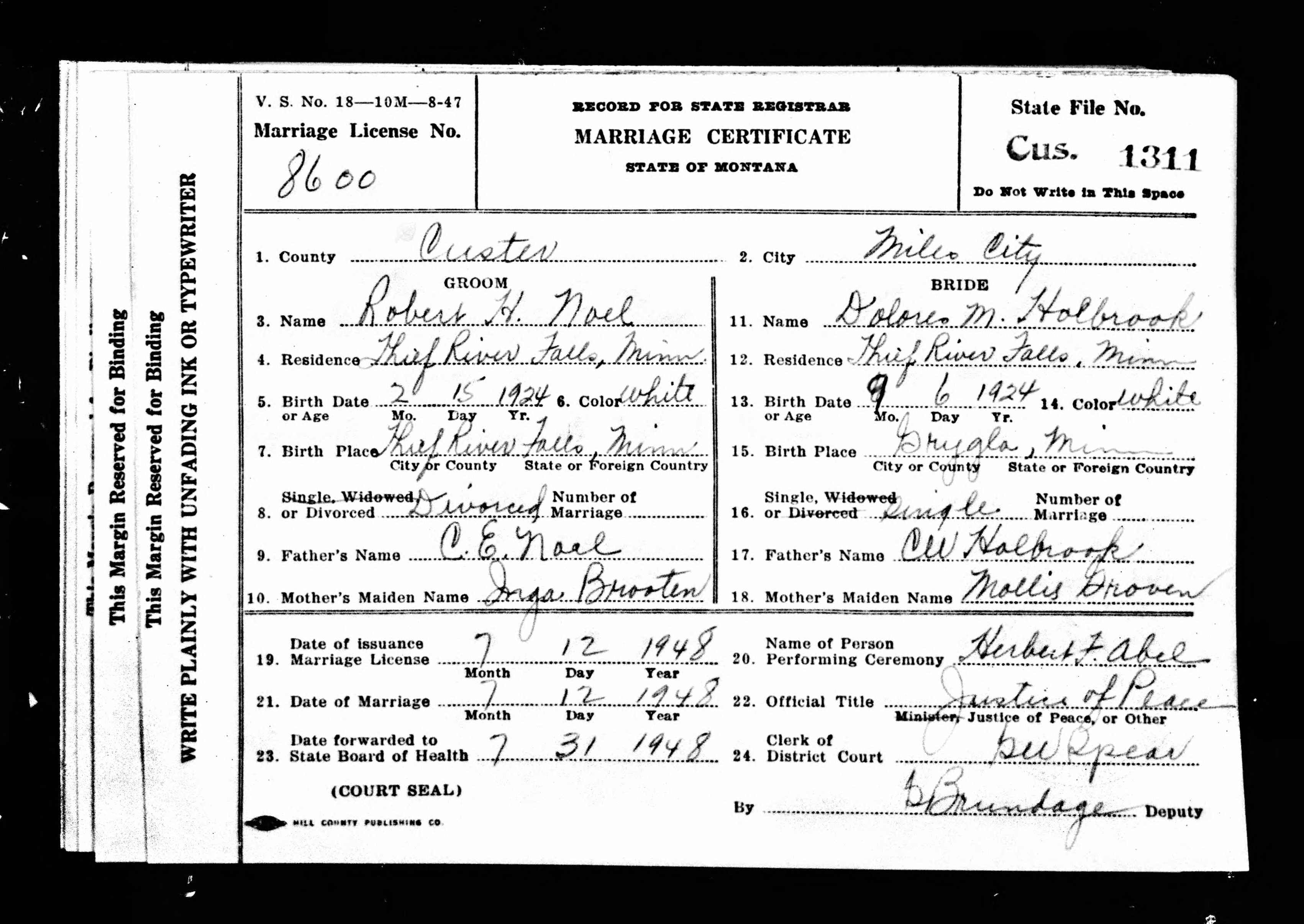 Robert H. Noel and Dolores M. Holbrook Montana Marriage Certificate in 1948