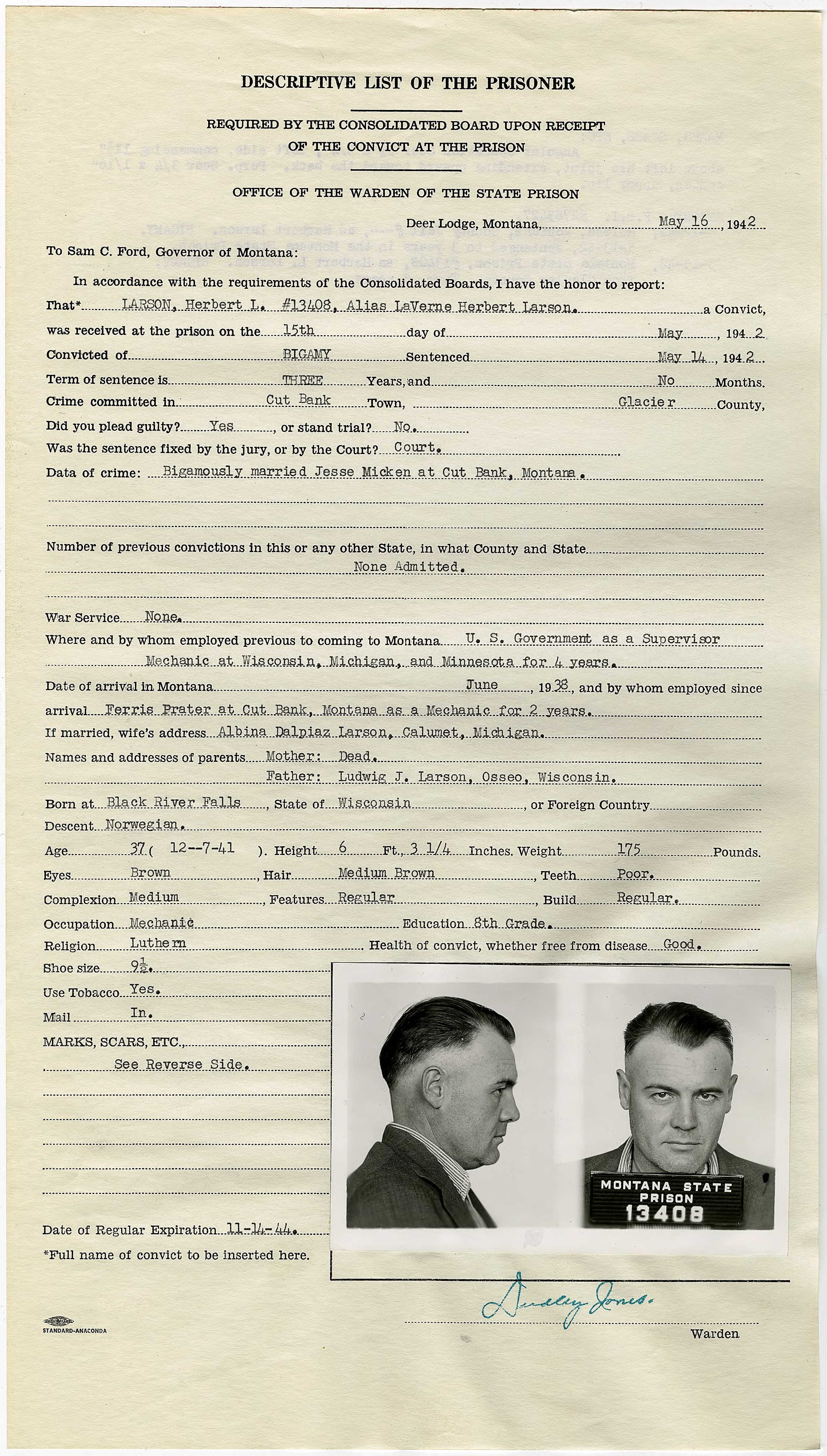 Montana State Prison Descriptive List of Prisoner LaVerne Herbert Larson, as he was received on May 15, 1942 (page 1 of 2)