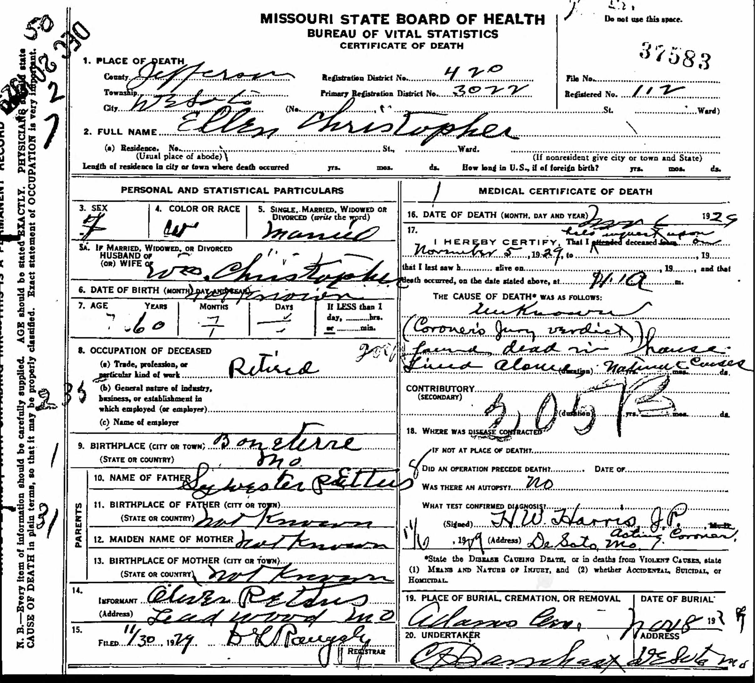 Ellen Christopher Death Certificate