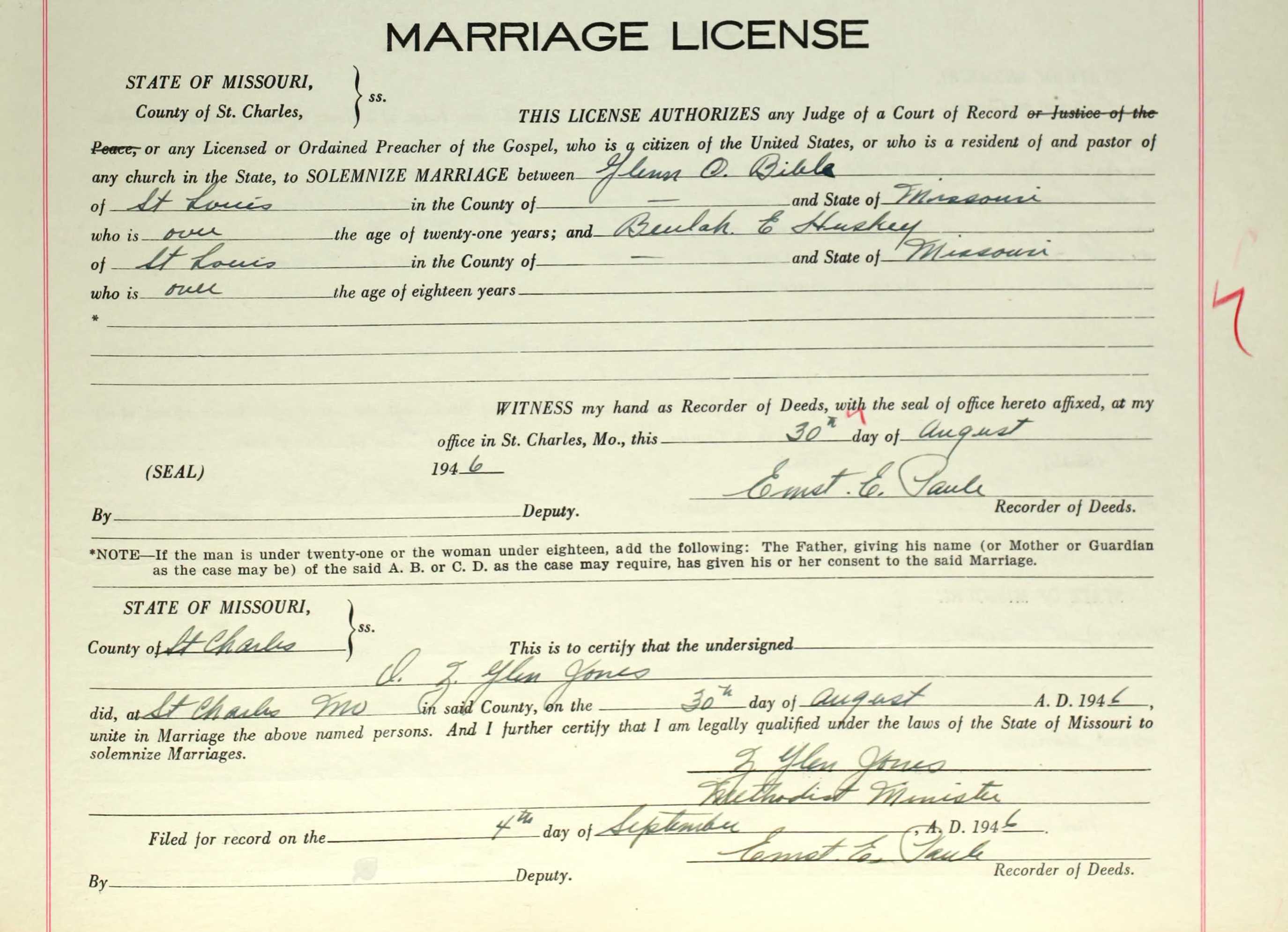 Beulah E. Huskey and Glenn O. Bible Marriage License in 1946