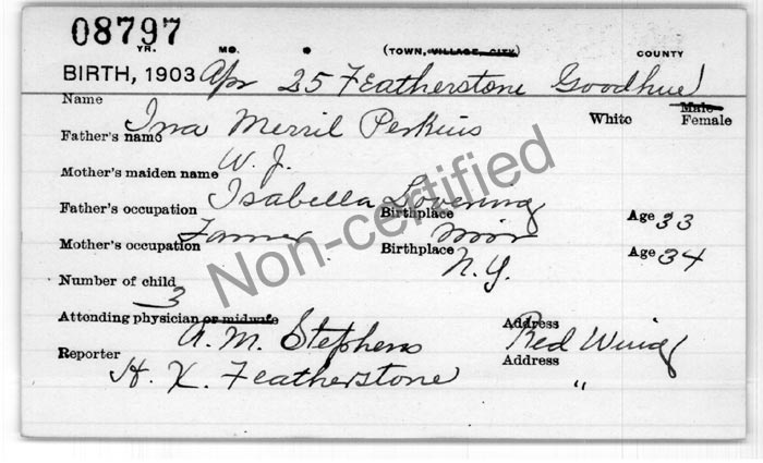 Ina Merril Perkins Birth Certificate