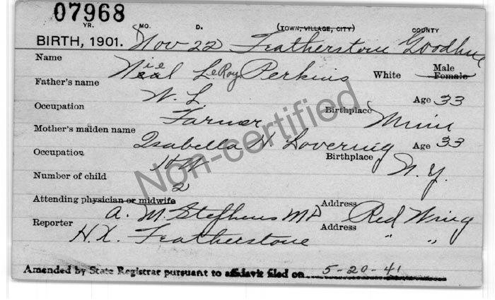 Niel LeRoy Perkins birth certificate