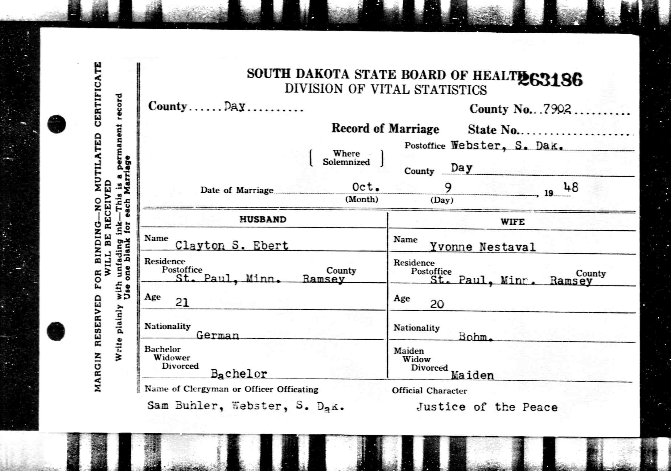 Marriage Certificate for Yvonne Nestaval and Clayton Ebert in 1948