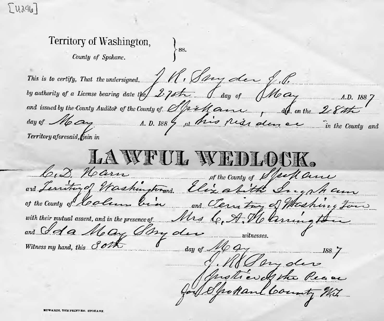 Marriage Certificate for C.D. Harn and Elizabeth Ingraham, on 30 May 1887 in Spokane County, Washington