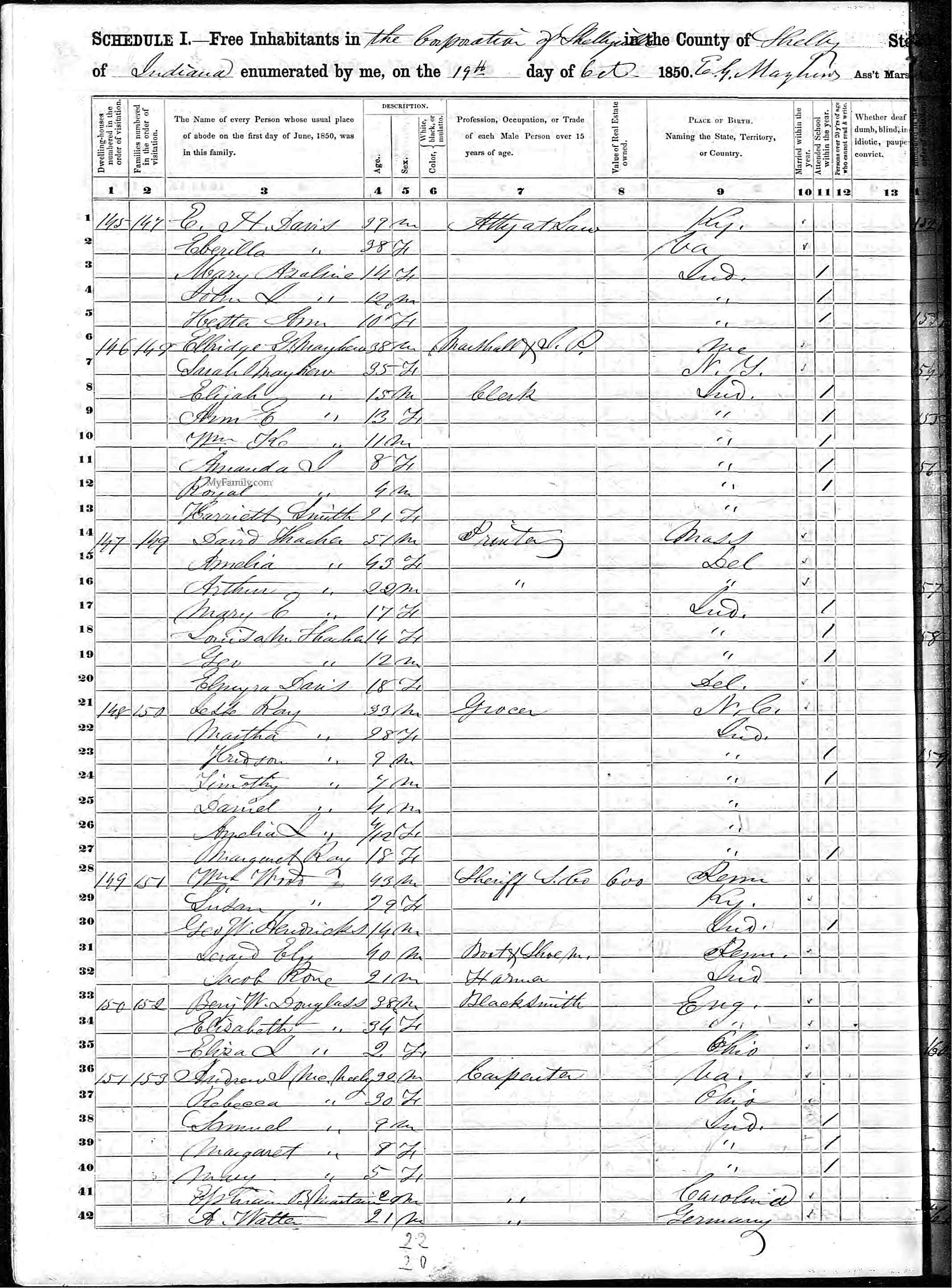 1850 United States Federal Census - Indiana, E. H. Davis and family
