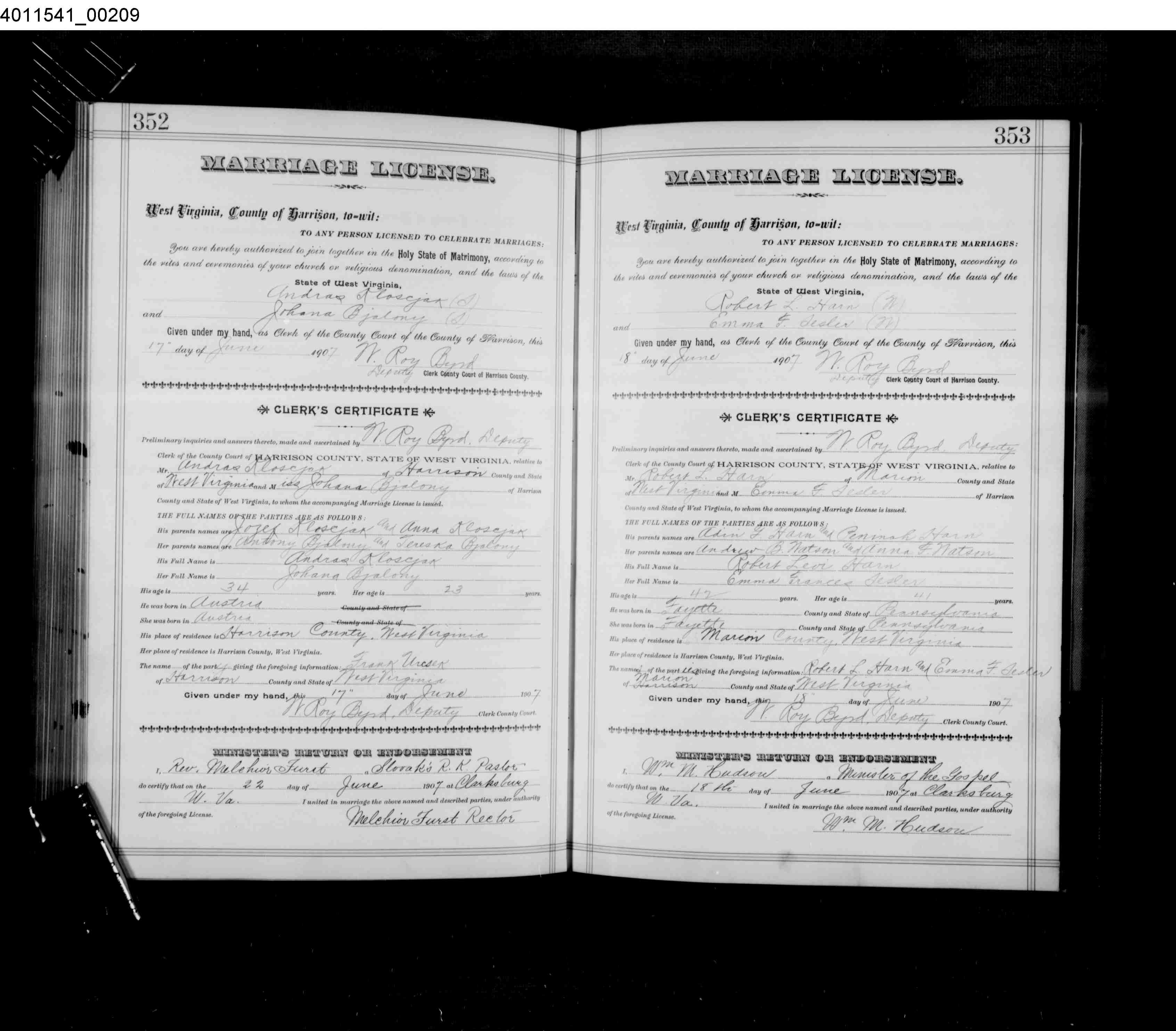 Marriage License for Robert Levi Harn and Emma Frances Sesler on 18 Jun 1907