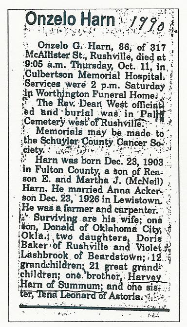 Obituary for Onzelo Harn from an undated unknown newspaper.
