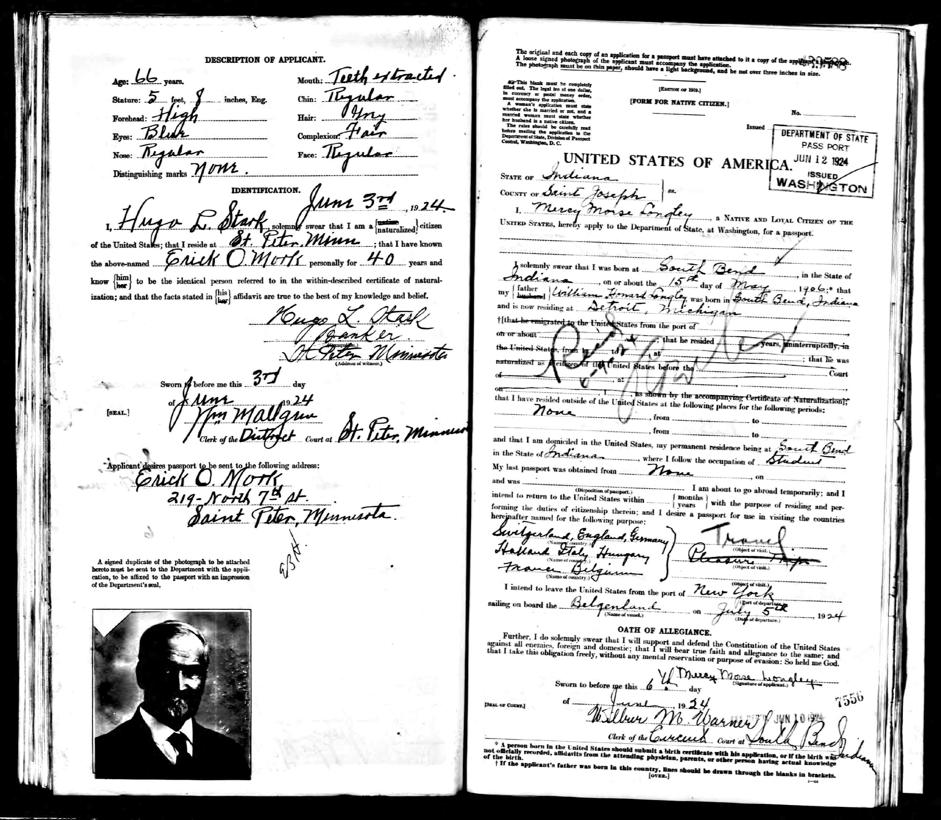 Mercy Morse Longley Passport application on 06Jun1924 (page 1)