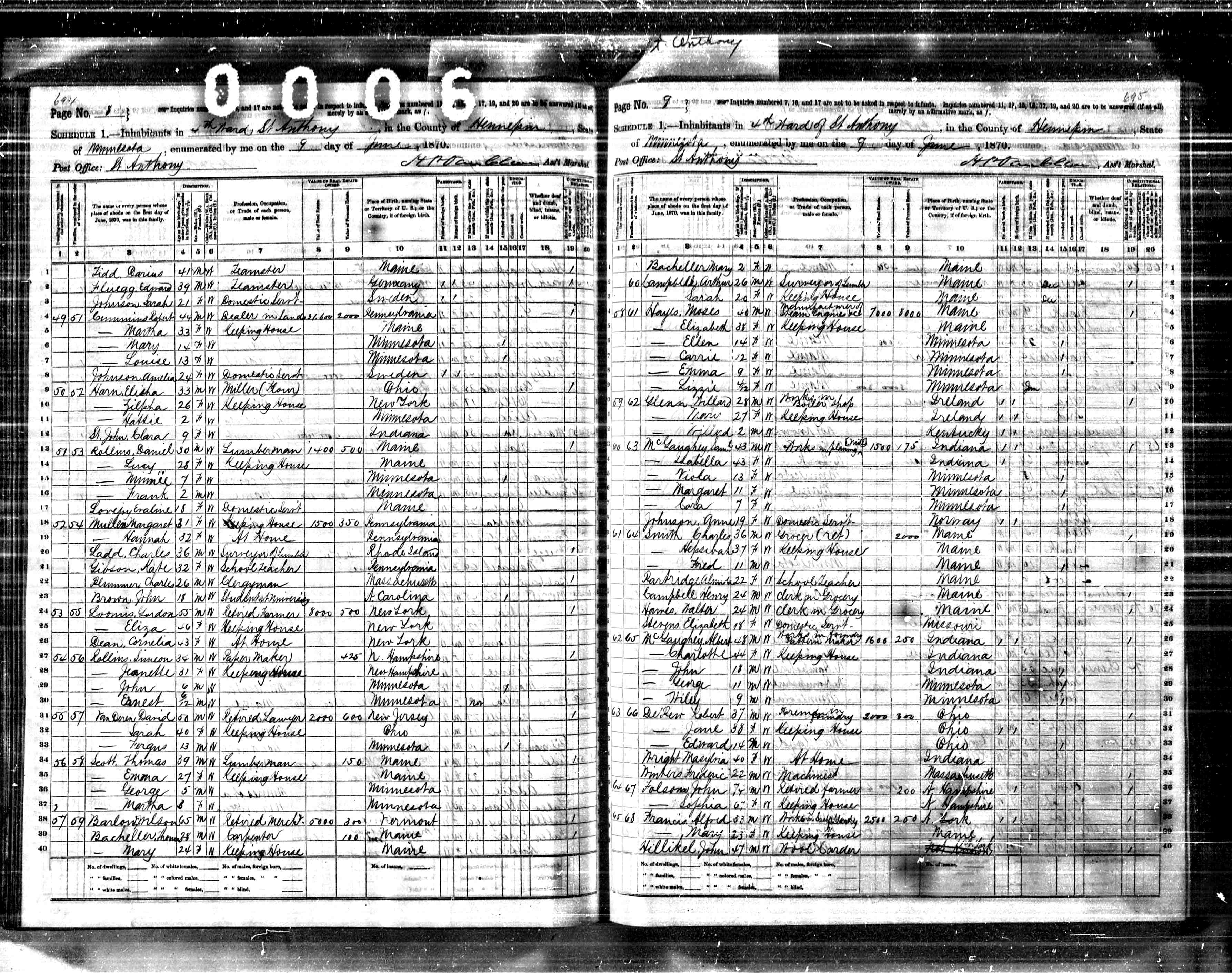 1870 Federal Census in Minnesota, listing Elisha Harn, wife Zilpha, daughter Hattie, and Clara St. John