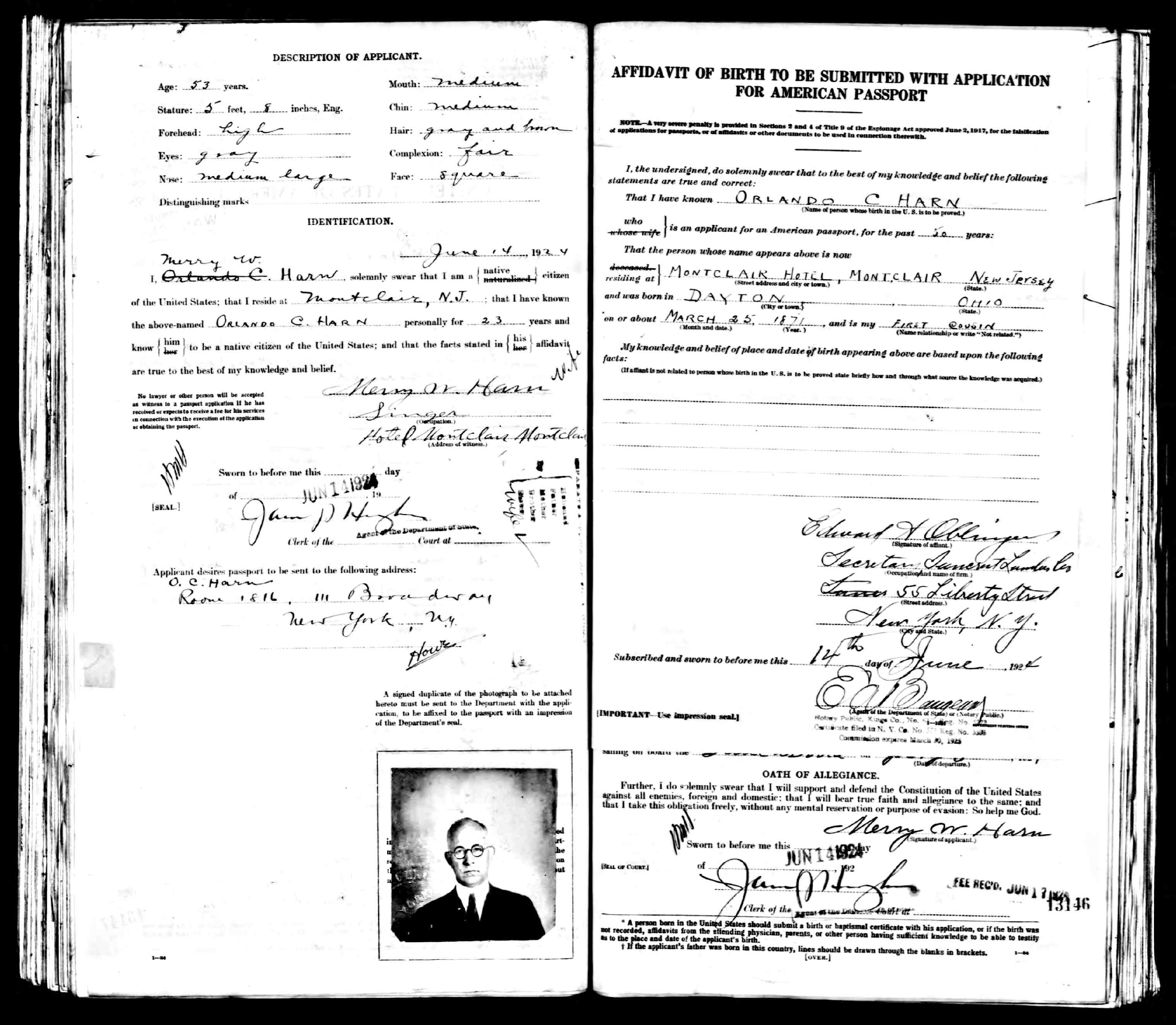 Orlando Clinton Harn was issued a passport on 18 Jun 1924