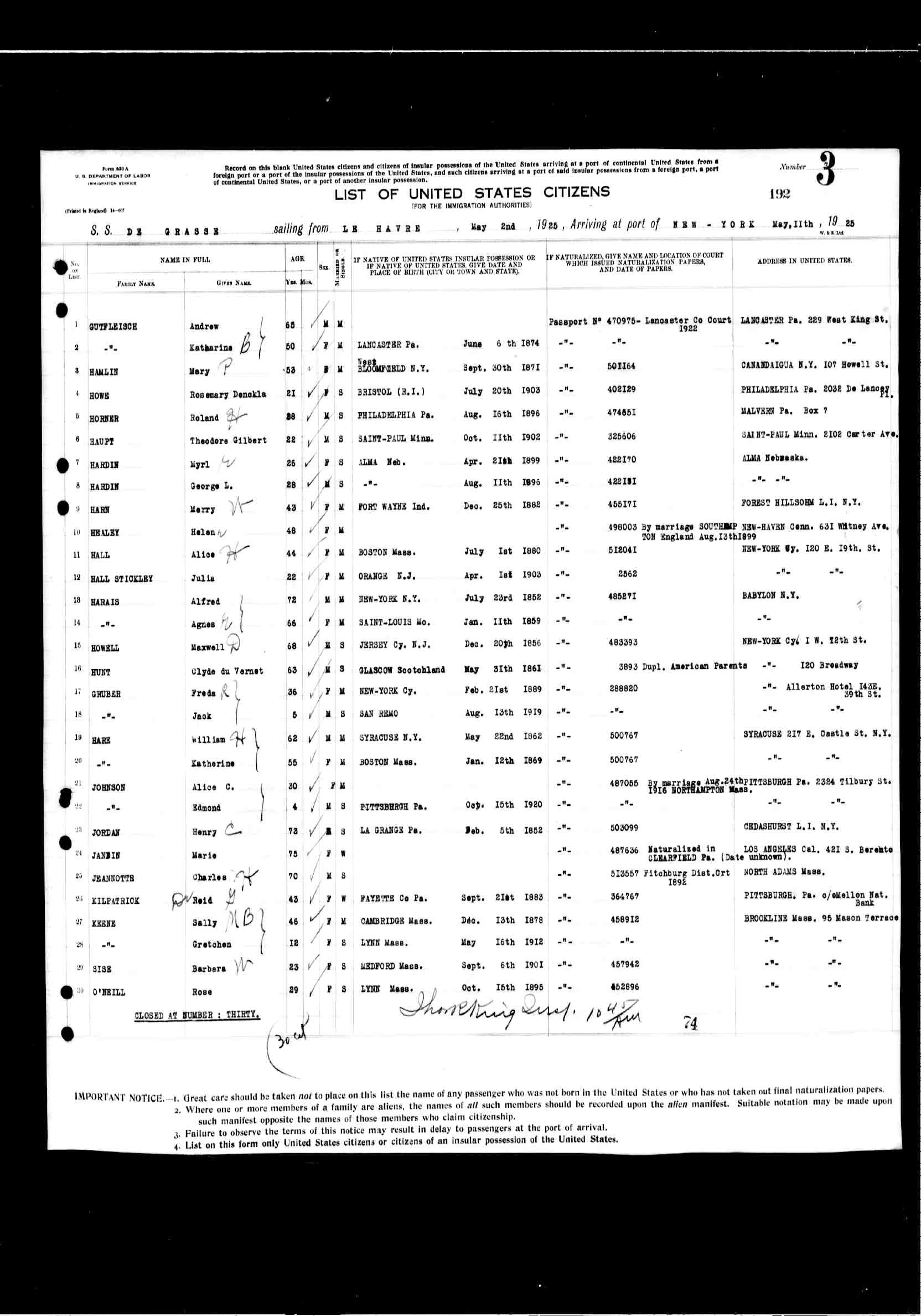 New York Passenger Lists shows Merry W. Harn arriving 11 May 1925 in New York